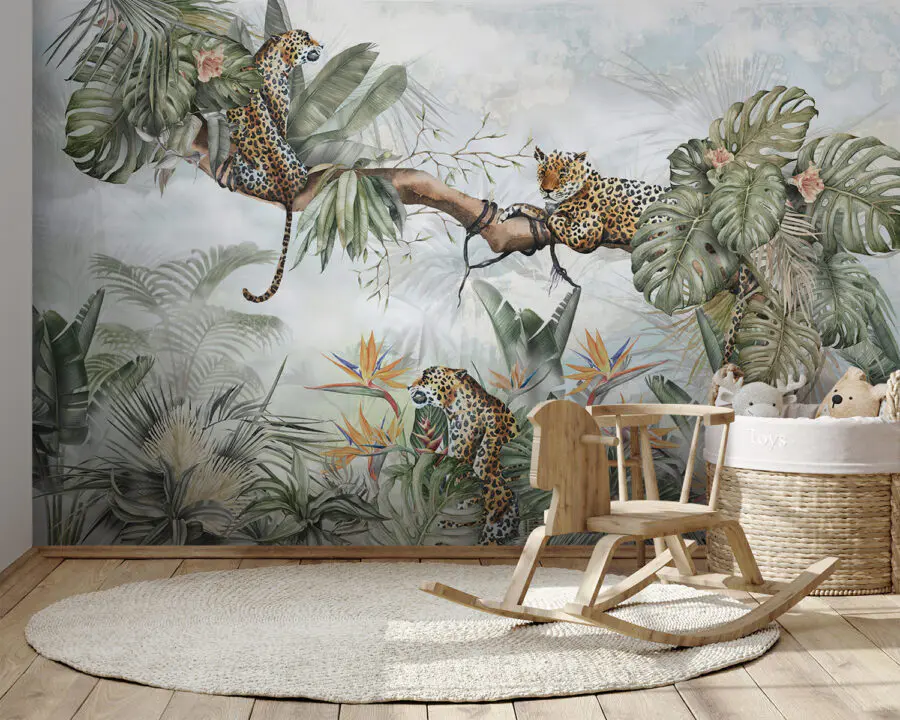 Transformez votre espace avec cette peinture murale enchanteresse représentant des léopards dans une jungle luxuriante. Imaginez un coin douillet où les enfants peuvent laisser libre cours à leur imagination, qu’il s’agisse d’histoires aventureuses d’explorateurs de la jungle ou d’après-midi tranquilles, blottis dans un livre. Ces léopards espiègles perchés dans les arbres feuillus susciteront la curiosité et l’émerveillement. La verdure éclatante et les fleurs colorées créent une toile de fond joyeuse, fraîche et vivante. C’est l’idéal pour ajouter une touche de nature à l’intérieur, en faisant de chaque regard une mini évasion. Alors, respirez l’ambiance de la jungle et commencez à vous amuser !