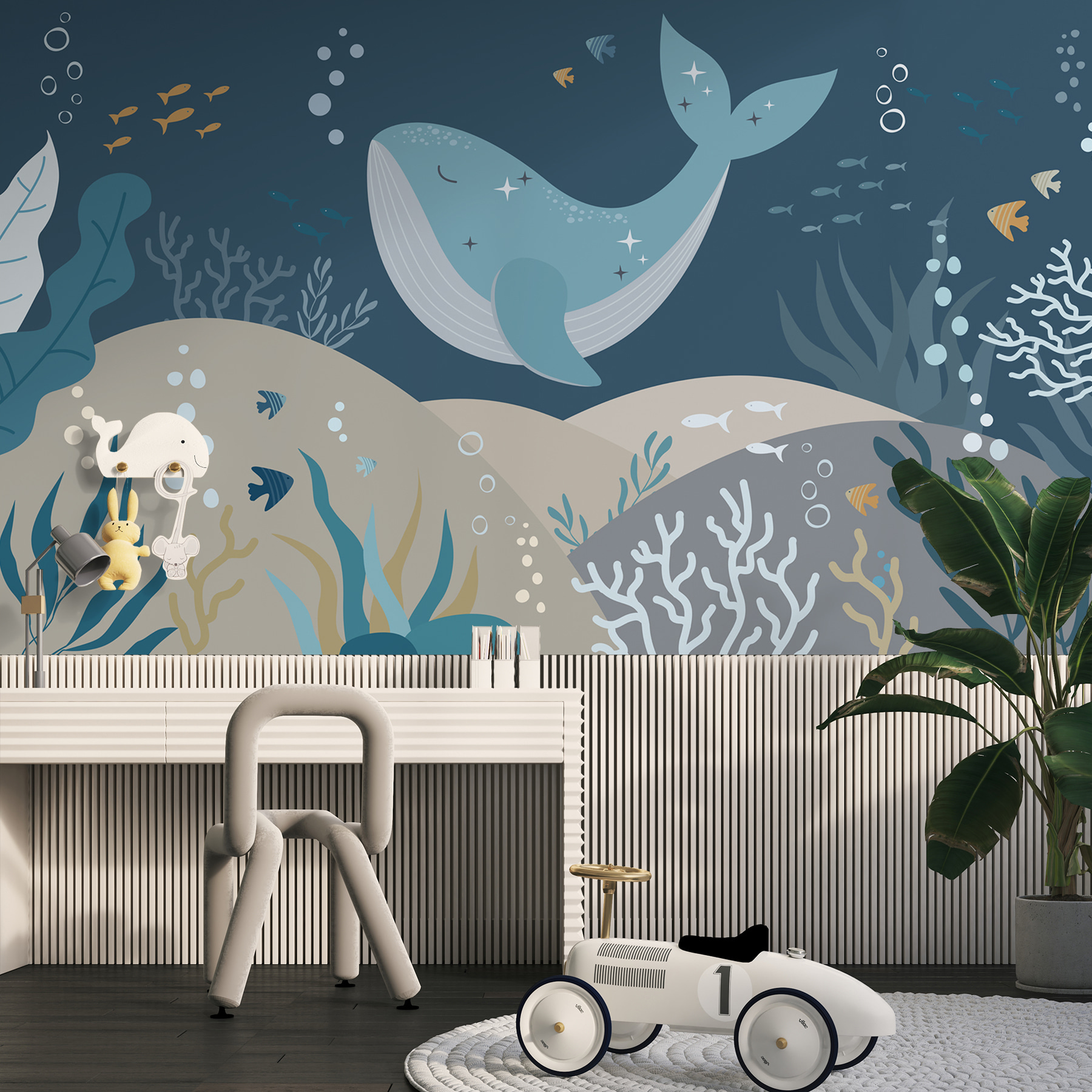 Jetez un coup d’œil à cette peinture murale fantaisiste, “Baleine bleue avec des étoiles et des poissons”. Sérieusement, c’est comme plonger dans un pays de rêve sous-marin ! Parfait pour une chambre d’enfant, imaginez une baleine bleue dérivant doucement, parsemée d’étoiles scintillantes, entourée de poissons espiègles. Ne vous étonnez pas si les petits se perdent dans leurs propres aventures océaniques. Les tons bleus doux sont comme une étreinte calme – ah, si apaisante. Transformez l’heure du coucher en un voyage magique en mer tous les soirs avec cette peinture murale enchanteresse. C’est comme si vous apportiez un morceau de l’océan dans votre maison !