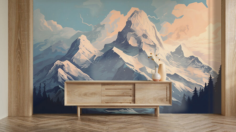 Imaginez que vous entrez dans une cabane confortable, que l’odeur du pin flotte dans l’air, et voilà la peinture murale de montagnes imposantes enveloppées dans des couvertures enneigées et des nuages cotonneux. Cette œuvre n’est pas seulement une toile de fond ; c’est une invitation à rêvasser aux matins alpins et aux aventures qui vous attendent de l’autre côté de la porte. Imaginez-vous en train de siroter un chocolat chaud alors que le monde extérieur est recouvert de blanc et que vous ne voyez que ces pics majestueux. Parfaite pour un salon ou un coin lecture, cette peinture murale fait entrer l’extérieur, donnant à chaque regard l’impression d’une mini escapade. Parfait pour ceux qui ont envie d’une touche de majesté de la nature sans les engelures !