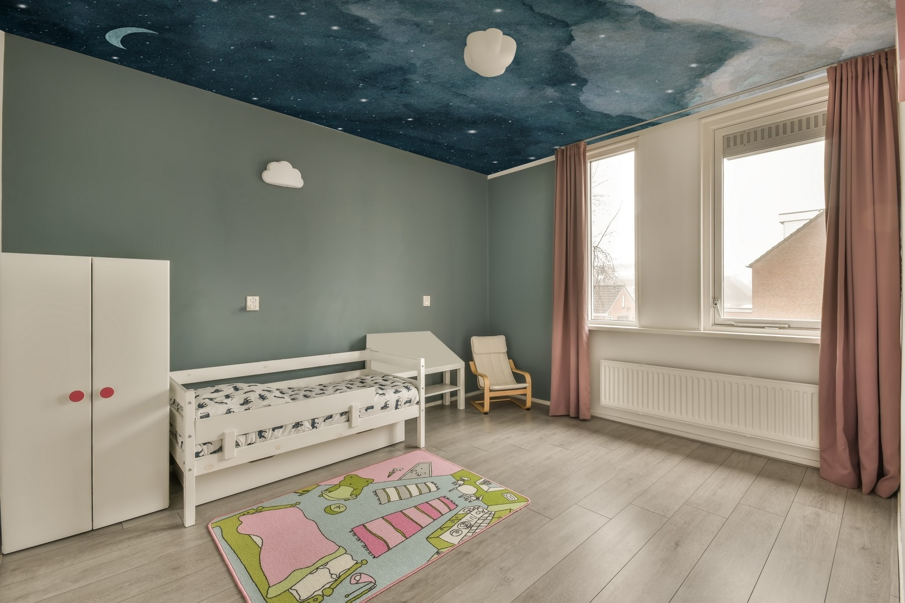 Voici une peinture murale qui vous fera flotter sur un nuage, littéralement ! La peinture murale “Nuages et étoiles dans le ciel” fait entrer une nuit étoilée de rêve dans votre espace. Parfait pour les chambres d’enfants ou toute personne souhaitant transformer sa chambre en un pays des merveilles nocturnes. Imaginez-vous allongé dans votre lit, regardant les nuages doux et les étoiles scintillantes – vous aurez l’impression de voler dans le ciel nocturne.