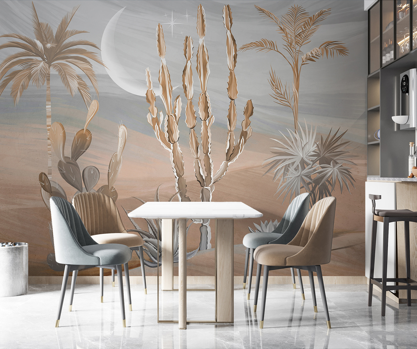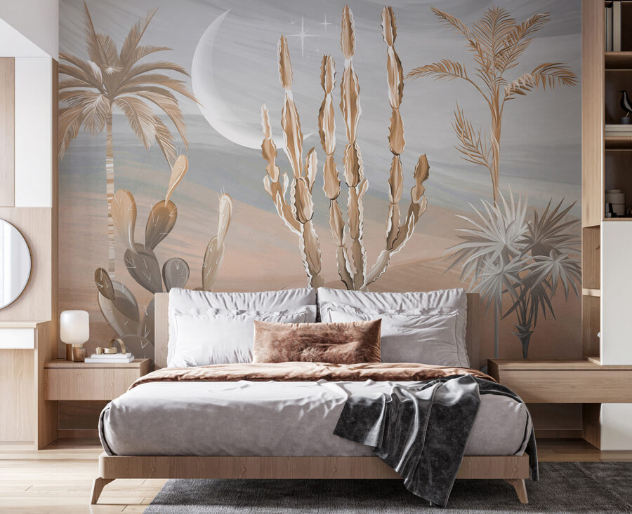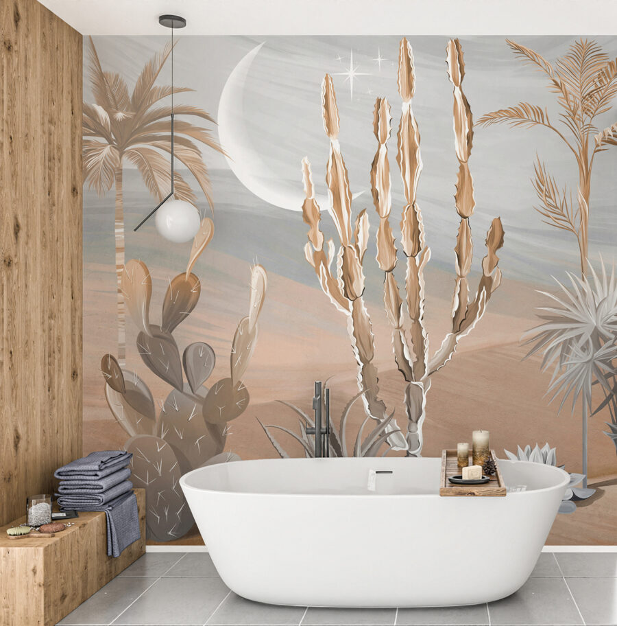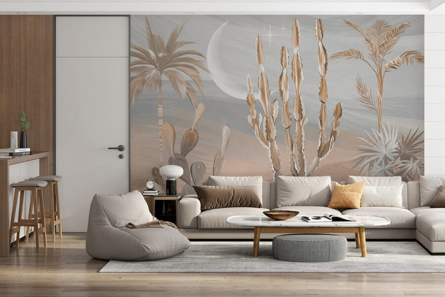 Jetez un coup d’œil à cette fresque murale radicale ! Imaginez que vous fassiez entrer une partie du désert dans votre salon – des cactus, des palmiers et un paysage de rêve. C’est comme pénétrer dans une oasis sereine sans la chaleur torride et les plantes piquantes. Parfait pour ajouter une touche d’exotisme à n’importe quel espace.