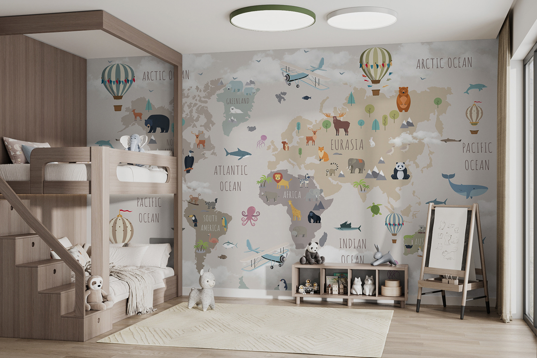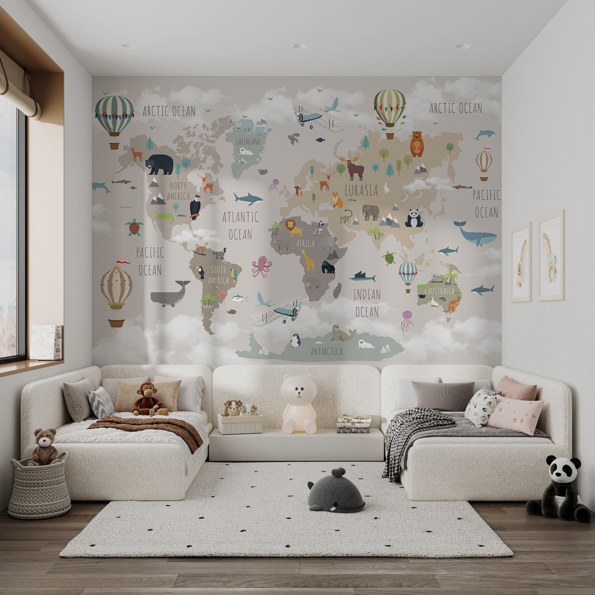 Cette peinture murale n’est pas seulement une décoration, c’est une expérience à part entière. Les enfants peuvent découvrir les différents continents et océans tout en apercevant leurs animaux préférés, des ours polaires du Groenland aux kangourous d’Australie. Les couleurs sourdes sont apaisantes, parfaites pour les histoires à l’heure du coucher ou les dimanches après-midi paresseux. C’est le genre de décor qui stimule l’imagination et la curiosité, ce qui le rend idéal pour les crèches, les salles de jeux ou même les salles de classe. De plus, le fait de repérer chaque jour de nouveaux détails entretient la magie.