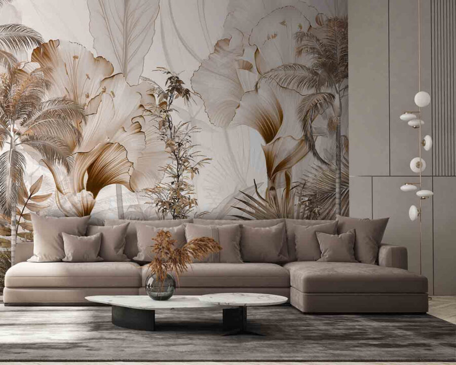 Vous envisagez de donner à votre espace une touche d’exotisme ? Jetez un coup d’œil aux “Peintures murales Feuillage tropical dans les tons sépia”. Imaginez que les teintes douces et chaudes du sépia transforment vos murs en une élégante échappée dans la jungle, parfaite pour les jours maussades où vous avez besoin de vous évader mentalement. Le mélange de feuillages et de motifs d’arbres donne une impression de richesse et de superposition qui transforme n’importe quelle pièce en un havre tropical sophistiqué. C’est comme si vous faisiez entrer la forêt tropicale dans votre salon sans avoir à vous préoccuper de l’humidité ou des insectes, ce qui est un avantage ! De plus, il est suffisamment polyvalent pour s’intégrer dans des espaces minimalistes ou compléter facilement un décor plus chargé. Qu’il s’agisse de votre chambre à coucher ou de votre bureau à domicile, cette peinture murale illumine l’espace d’une atmosphère invitante et douillette. Vous entendrez presque le bruissement des feuilles et sentirez une douce brise. Vous avez un ami qui aime les décors luxuriants inspirés de la nature ? Ils vont adorer !
