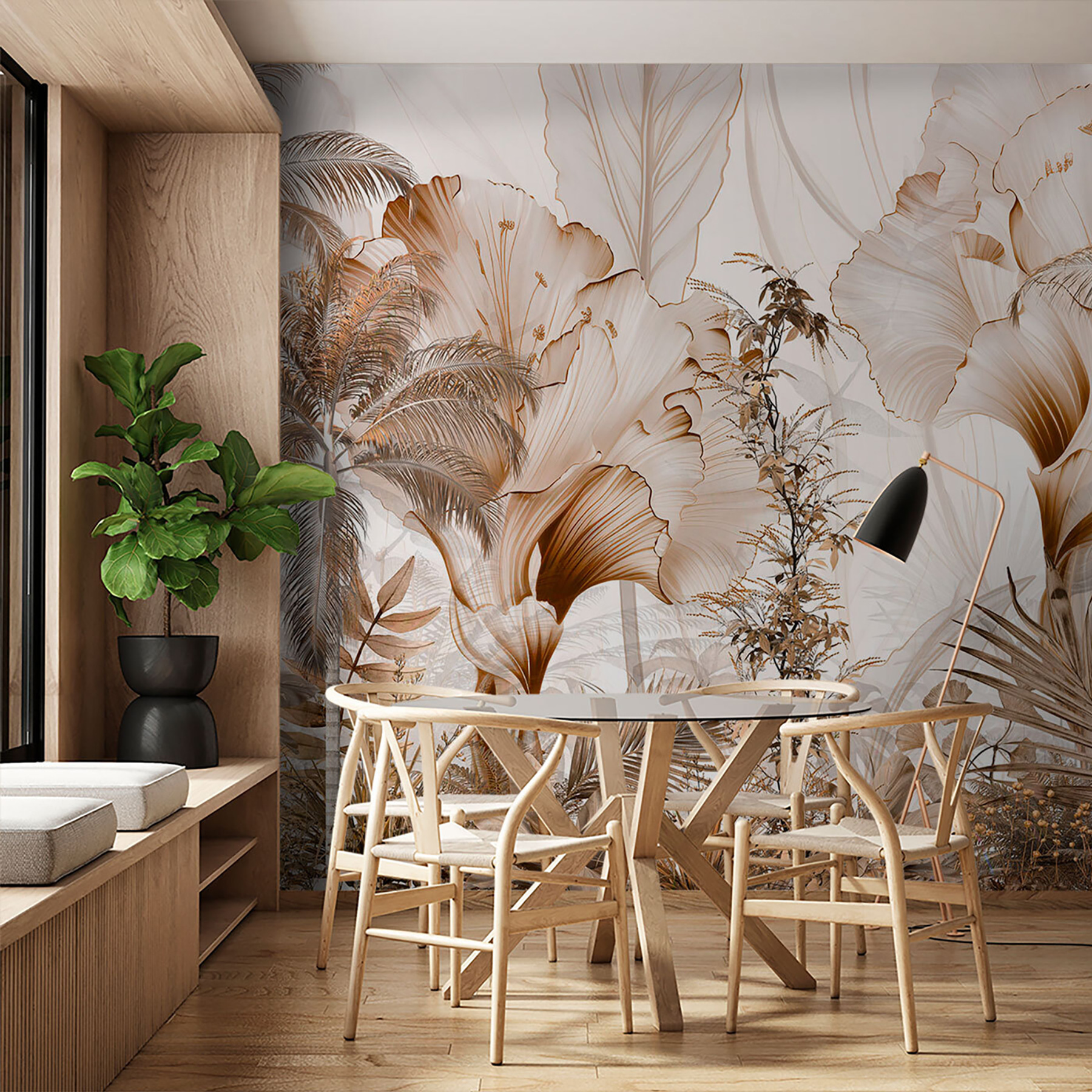 Vous envisagez de donner à votre espace une touche d’exotisme ? Jetez un coup d’œil aux “Peintures murales Feuillage tropical dans les tons sépia”. Imaginez que les teintes douces et chaudes du sépia transforment vos murs en une élégante échappée dans la jungle, parfaite pour les jours maussades où vous avez besoin de vous évader mentalement. Le mélange de feuillages et de motifs d’arbres donne une impression de richesse et de superposition qui transforme n’importe quelle pièce en un havre tropical sophistiqué. C’est comme si vous faisiez entrer la forêt tropicale dans votre salon sans avoir à vous préoccuper de l’humidité ou des insectes, ce qui est un avantage ! De plus, il est suffisamment polyvalent pour s’intégrer dans des espaces minimalistes ou compléter facilement un décor plus chargé. Qu’il s’agisse de votre chambre à coucher ou de votre bureau à domicile, cette peinture murale illumine l’espace d’une atmosphère invitante et douillette. Vous entendrez presque le bruissement des feuilles et sentirez une douce brise. Vous avez un ami qui aime les décors luxuriants inspirés de la nature ? Ils vont adorer !