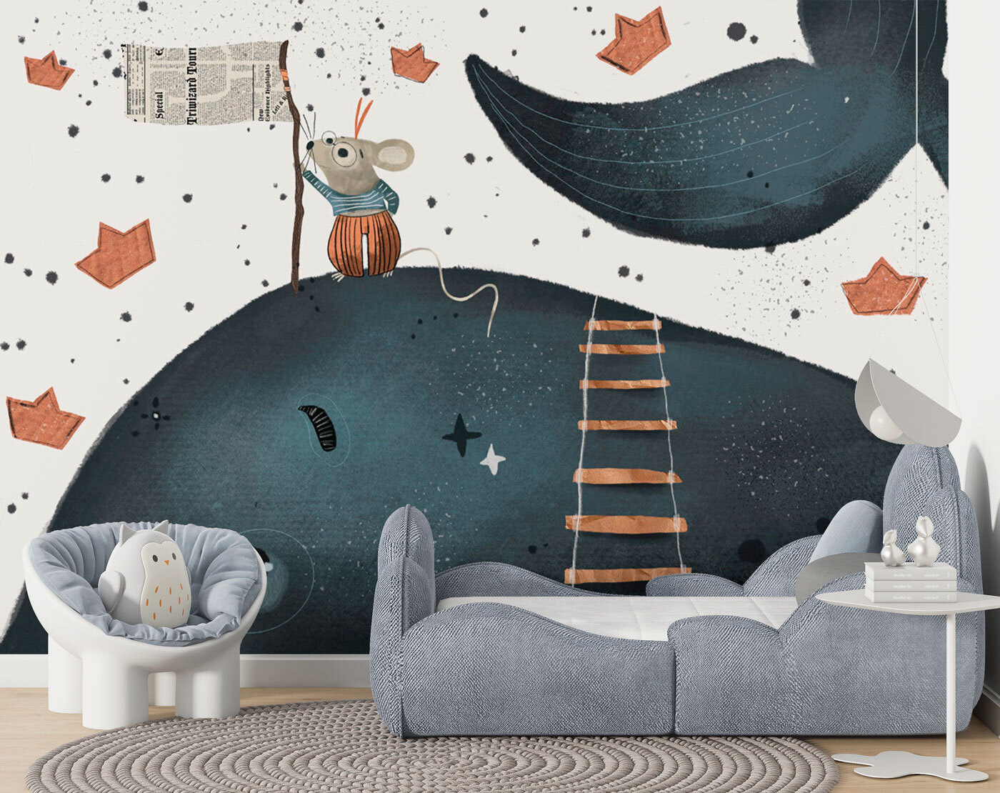 Transformez l’espace de votre enfant en une aventure fantaisiste grâce à cette ravissante peinture murale. Imaginez une souris joyeuse grimpant courageusement à une échelle, agitant un drapeau sur une baleine amicale, entourée de charmants bateaux en papier. C’est une histoire visuelle qui ne demande qu’à éveiller l’imagination des petits.