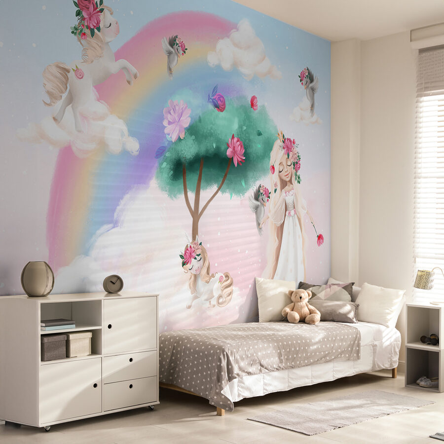 Imaginez : vous entrez dans une pièce où les licornes se pavanent sur des nuages cotonneux et où les arcs-en-ciel s’inclinent gracieusement au-dessus d’une scène fantaisiste. Cette peinture murale “Licornes et arcs-en-ciel dans une scène magique” transforme toute chambre d’enfant en un paradis de rêve. Parfaite pour les chambres d’enfants, les salles de jeux ou tout espace réservé aux amoureux des licornes, elle associe des couleurs vives et des éléments fantastiques pour stimuler l’imagination. Imaginez votre enfant en train de contempler les charmantes licornes et peut-être même de rêver à ses propres aventures. Il ne s’agit pas seulement d’une peinture murale, mais d’une expérience magique quotidienne ! De plus, c’est une façon amusante d’inspirer des histoires ou de rendre l’heure du coucher un peu plus enchantée.