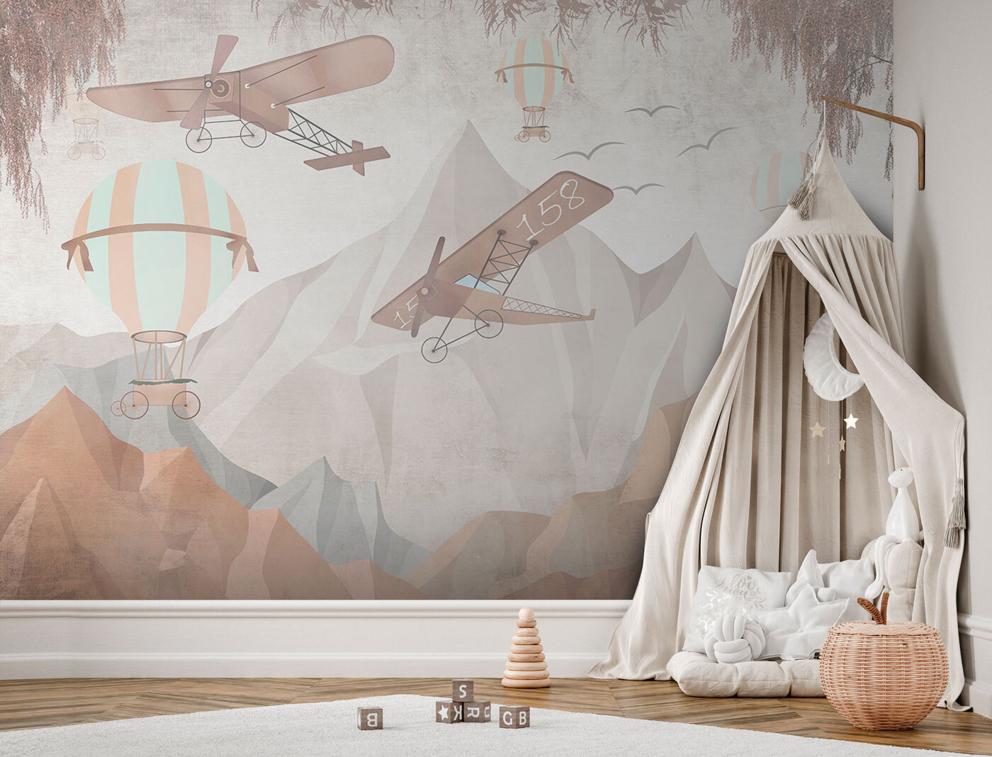 Imaginez votre enfant en train de regarder en l’air, peut-être en train d’imaginer qu’il est à bord d’un de ces charmants ballons. Il ne s’agit pas seulement d’une peinture murale, mais d’un tremplin pour des aventures et des histoires au pays des rêves. Que votre enfant rêve de piloter un avion d’époque ou de flotter au-dessus des nuages, cette peinture murale suscite facilement la créativité et la joie. Vous vous sentez inspiré ? Oui, c’est aussi puissant que cela. De plus, qui n’aimerait pas une toile de fond qui permet de s’évader instantanément au sommet d’une montagne sereine ? Tout à fait charmant.
