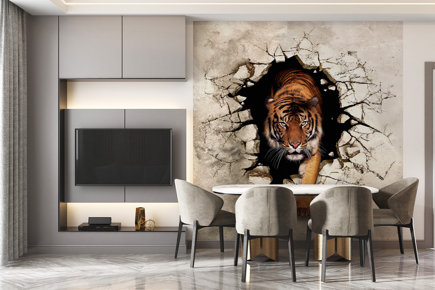 Vous avez déjà pensé à un tigre féroce traversant votre mur ? Cette étonnante peinture murale d’un tigre émergeant d’un mur fissuré est parfaite si vous aimez les décors sauvages ! Imaginez : vous entrez dans le salon et voilà qu’un tigre surgit avec son regard intense et captivant. C’est comme si vous aviez un morceau de jungle dans votre maison, traversant le béton. C’est dramatique, cela attire l’attention et, honnêtement, c’est plutôt excitant. Qui n’a pas envie d’un peu d’aventure dans son espace ? De plus, c’est un excellent moyen d’engager la conversation : vos invités n’arrêteront pas d’en parler ! Ajoutez un peu de rugissement au décor de votre chambre avec cette peinture murale 3D hypnotique. Croyez-moi, vous adorerez l’audace qu’elle représente !