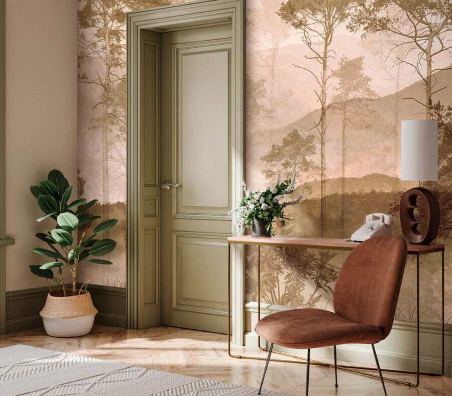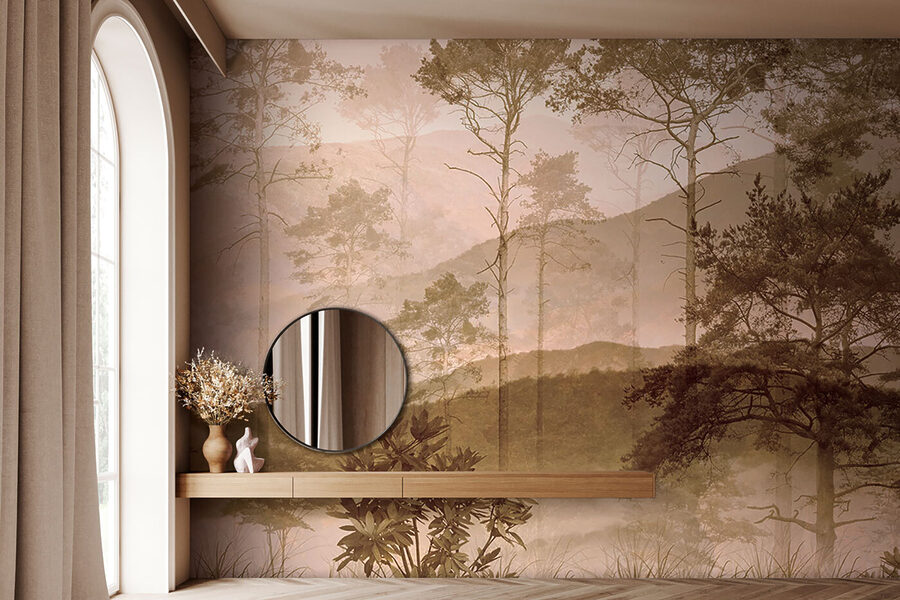 De plus, les tons subtils et l’effet de brume douce le rendent polyvalent, quel que soit le style de décoration. Ainsi, ce n’est pas seulement une peinture murale ; c’est une retraite calme qui apporte un peu de magie de la nature dans votre maison. 🌲🗻