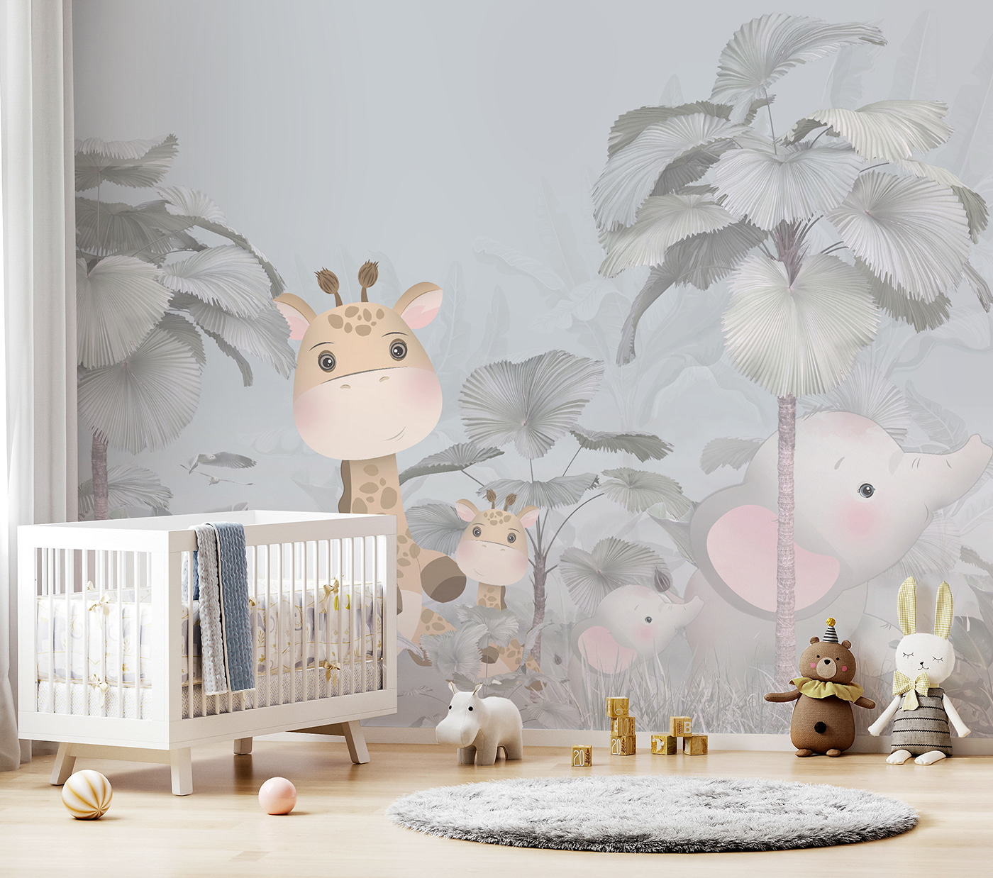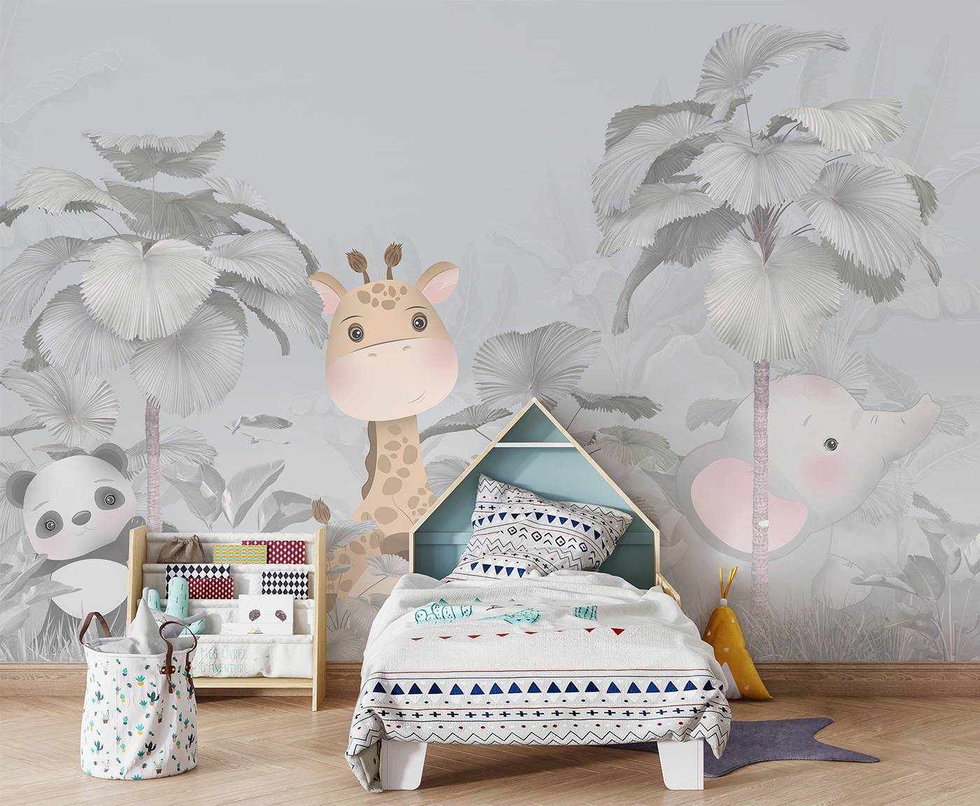 Imaginez que vous entrez dans la chambre de votre enfant et que vous êtes accueilli par une charmante girafe et un adorable éléphant qui se promènent dans une forêt fantaisiste et brumeuse. Cette peinture murale “Girafe et éléphant dans une forêt” est comme un livre d’histoires qui prend vie. Il ne s’agit pas seulement d’une jolie image – elle transforme toute la pièce en un endroit magique et rêveur. Il y a quelque chose de presque féerique ici, avec des couleurs pastel douces et ces animaux adorables aux yeux écarquillés qui se cachent derrière les feuilles géantes. Il est parfait pour stimuler l’imagination de votre enfant et ajouter une touche d’émerveillement à la nature. Qu’il s’agisse d’un fils ou d’une fille, tout le monde aura l’impression de pénétrer dans une jungle douillette et enchanteresse à chaque fois qu’il y entrera. Imaginez qu’ils se couchent le soir avec ces visages amicaux qui veillent sur eux. De plus, c’est un excellent sujet de conversation – vous pourriez même vous retrouver à inventer des histoires à dormir debout à propos de ces amis de la forêt.