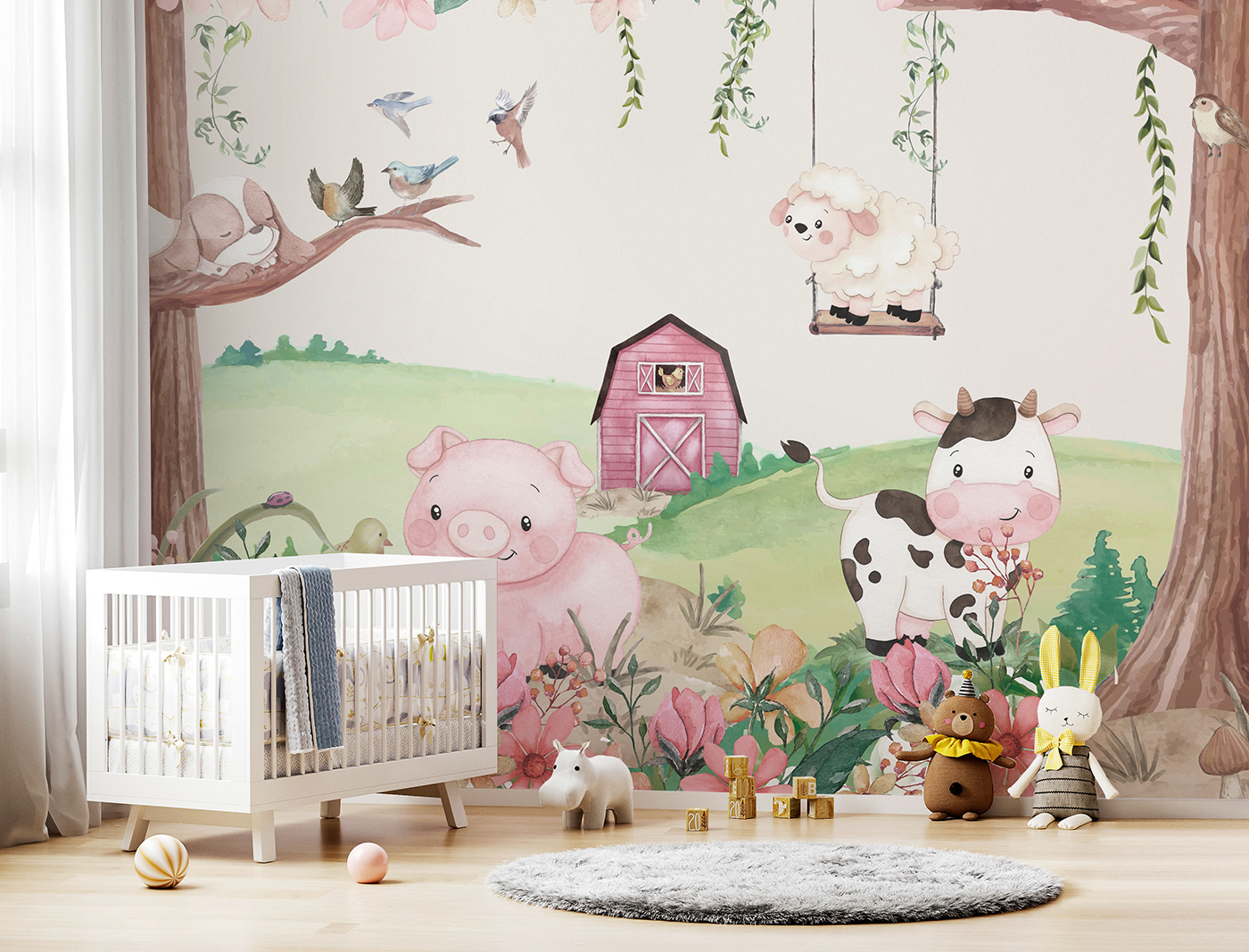 Bonjour à toutes et à tous ! Jetez un coup d’œil à cette adorable peinture murale – elle s’appelle ” Peinture murale Grange rose avec une poule à la fenêtre “. Honnêtement, c’est trop mignon pour être décrit ! Il est parfait pour ajouter une touche de charme à une chambre d’enfant, une salle de jeux ou un espace pour enfants. Imaginez que vous vous réveillez tous les jours devant cette scène adorable : une grange rose vif avec une poule curieuse à la fenêtre, entourée d’animaux joyeux et de fleurs colorées. C’est comme si un livre d’histoires prenait vie !