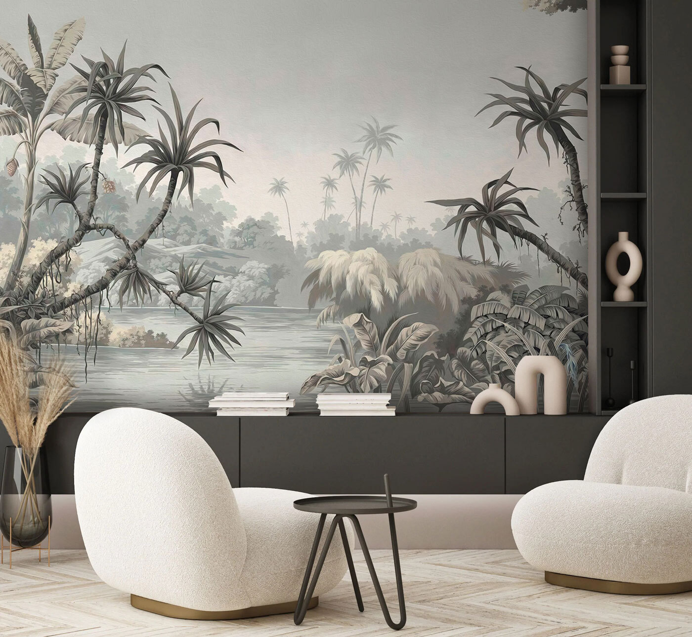 Imaginez que vous vous prélassiez dans votre salon et qu’au lieu de regarder des murs vides, vous soyez transporté dans cette oasis tropicale sereine, juste à côté de chez vous. Cette peinture murale “Paysage tropical en tons sourds” est comme une bouffée d’air frais avec une touche de mystère de la jungle. Il n’est pas trop bruyant, mais il capture toujours cette ambiance luxuriante et verte de feuillage dense et d’arbres exotiques.