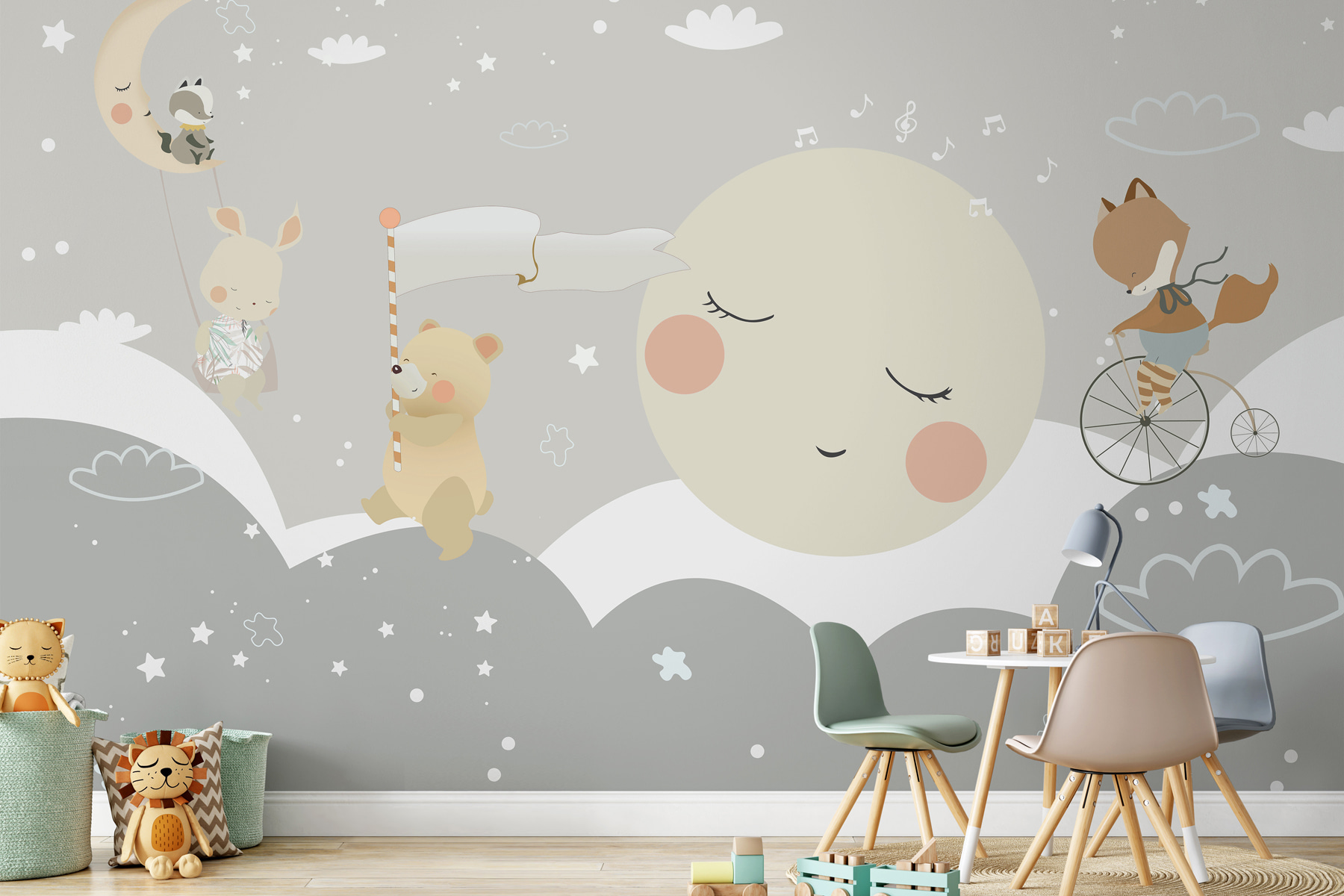 Jetez un coup d’œil à cette adorable peinture murale, “Étoile blanche sur fond gris”. C’est comme si vous entriez dans une histoire de rêve, parfaite pour une chambre d’enfant ou une salle de jeux. Cette peinture murale présente un fond gris apaisant parsemé d’étoiles scintillantes, d’une lune endormie et d’animaux mignons. Imaginez un ours endormi et un renard chevauchant un penny-farthing – des délices pour les petits explorateurs !
