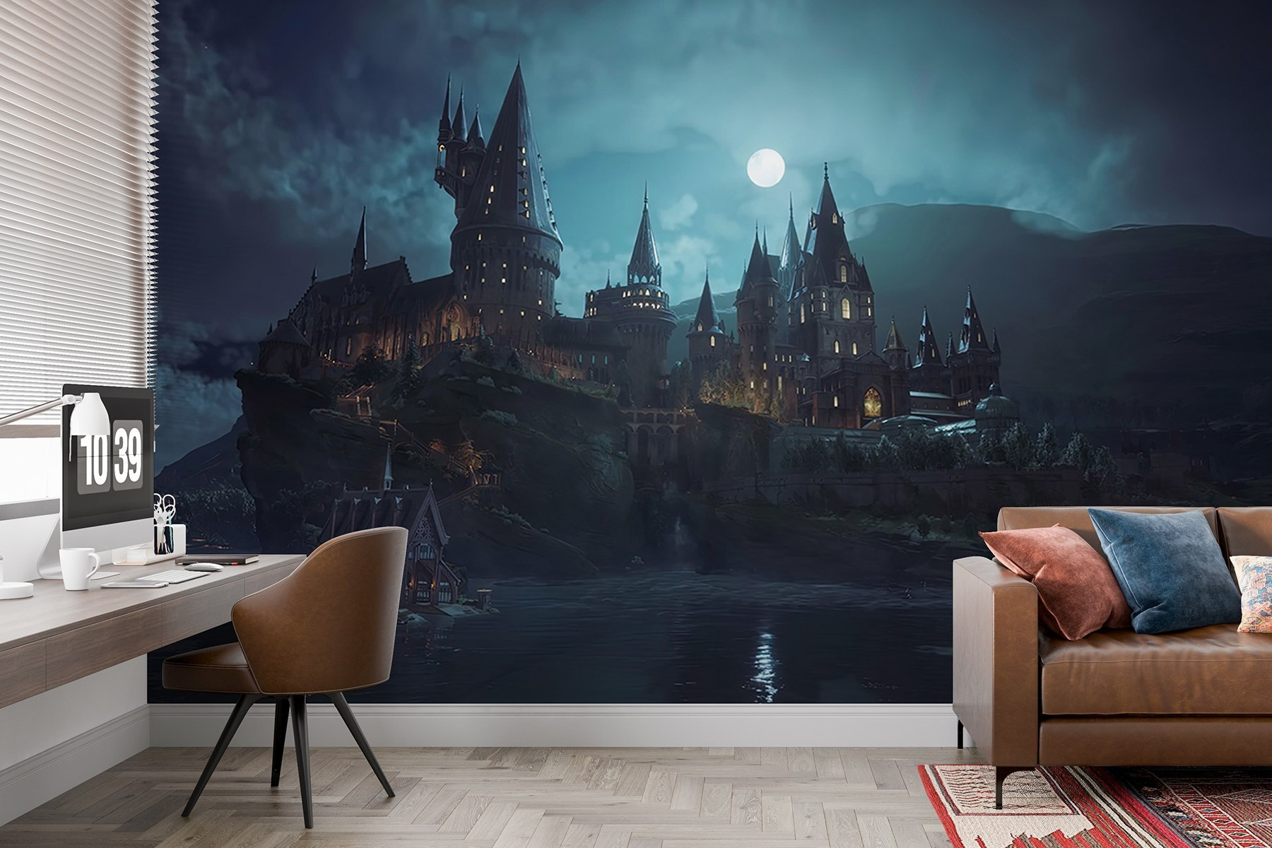 Transformez votre espace en une retraite de rêve avec cette peinture murale enchanteresse représentant un château perché sur une colline sous une lune brillante. Imaginez des soirées douillettes passées à contempler les tours majestueuses et à profiter de la magie de la nuit. C’est comme entrer dans un conte de fées, directement dans votre salon. Les bleus doux et les ombres sombres créent une atmosphère apaisante, parfaite pour se détendre après une longue journée. Vos amis vous demanderont peut-être même si vous êtes allé dans un autre monde ! Cette peinture murale n’est pas seulement de l’art ; elle invite à la rêverie et suscite des conversations, faisant de n’importe quel mur un point focal captivant.