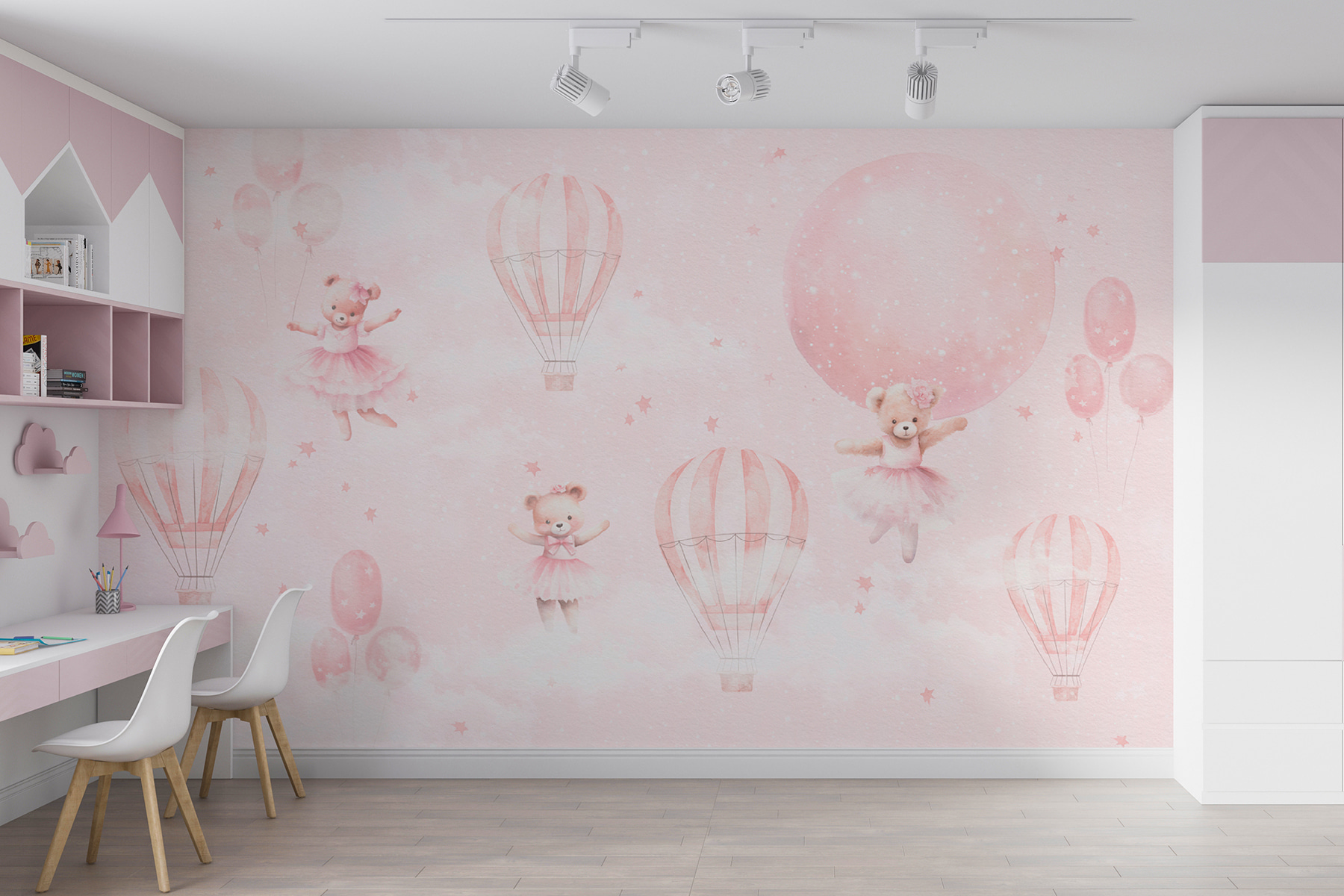 Cette peinture murale est un rêve devenu réalité pour n’importe quelle chambre d’enfant, surtout si vous avez un petit qui est obsédé par les ours en peluche, les tutus et tout ce qui est adorable. Imaginez : des ours en peluche en tutus froufroutants flottant parmi des nuages doux et pastel et des montgolfières – c’est comme une scène d’une histoire à dormir debout. Vous imaginez les yeux de votre fille s’illuminer dès qu’elle voit ça ? La magie est totale !