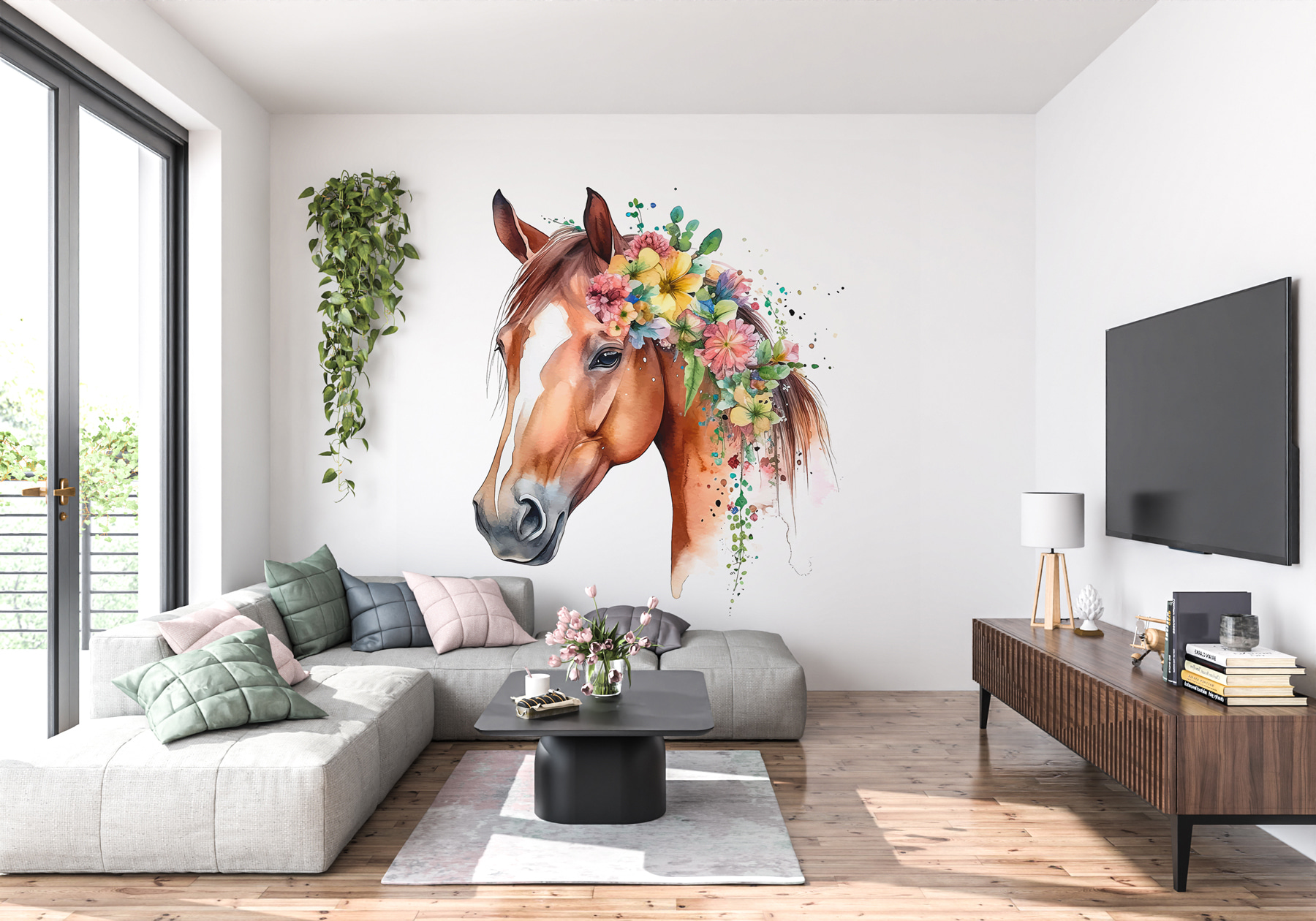 Imaginez que vous entrez dans une pièce et que vous êtes accueilli par un cheval majestueux paré de fleurs éclatantes. C’est exactement ce que fait cette peinture murale : elle transforme un mur ordinaire en une charmante surprise ! Elle est parfaite pour les amoureux des animaux, les enfants ou toute personne souhaitant ajouter une touche de fantaisie à son espace. Les couleurs sont si vives qu’elles ressortent pratiquement du mur. Imaginez la joie de votre enfant ou le sourire de vos invités à la vue de ce superbe étalon.