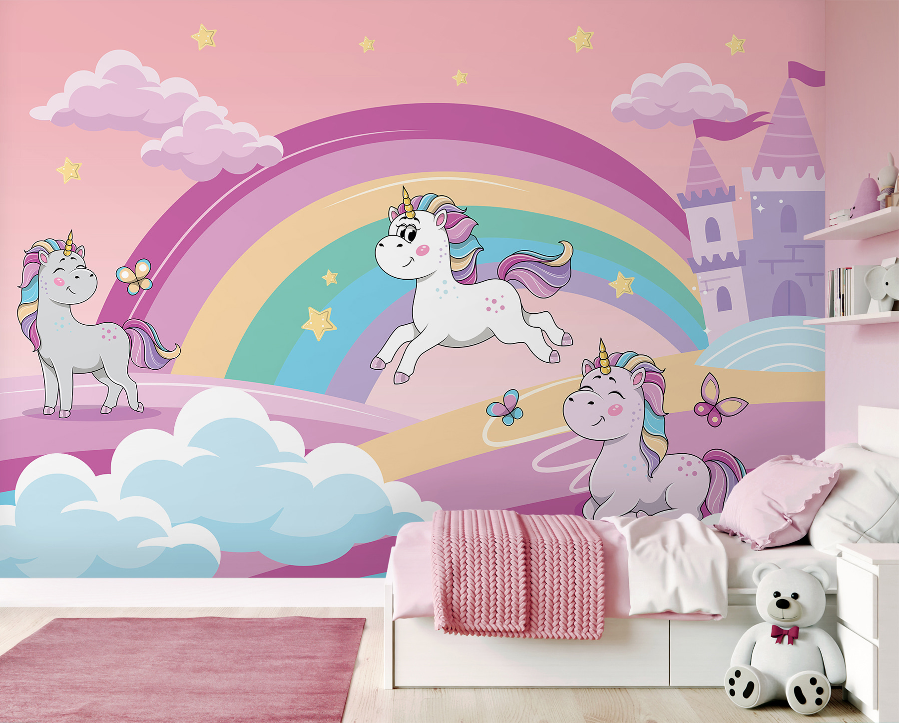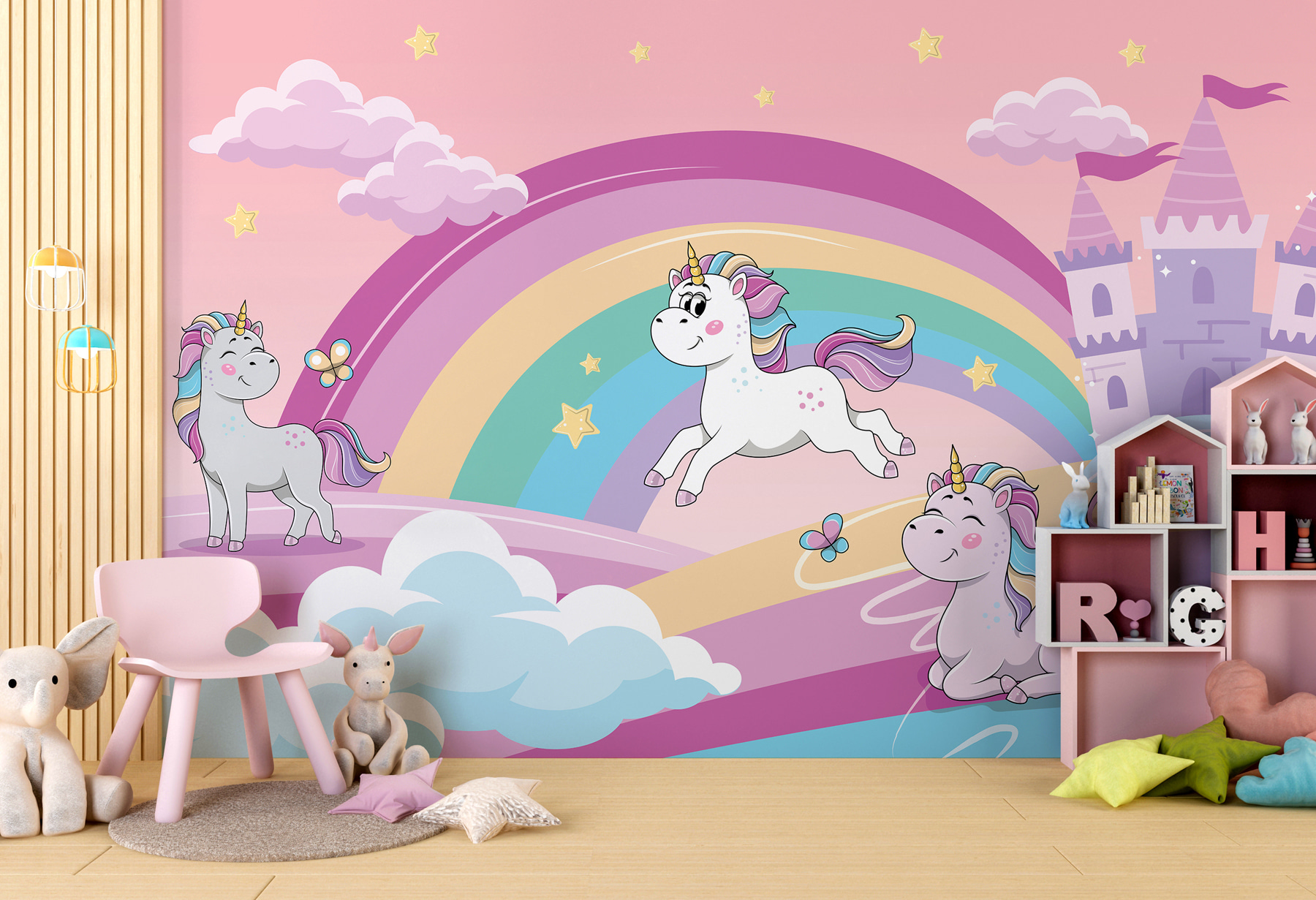 Transformez une pièce ordinaire en un lieu d’évasion fantaisiste grâce à cette adorable peinture murale de licorne ! Imaginez des papillons dansant autour d’arcs-en-ciel colorés, tandis que des licornes enjouées se pavanent sous un ciel rose tendre. C’est comme entrer dans un livre de contes où la magie n’est qu’à un battement de cœur. Parfaite pour stimuler l’imagination de votre enfant, cette peinture murale donne une impression de confort et d’amusement, faisant de chaque jour une aventure. Il ne manquera pas de susciter des sourires et des rires, ainsi qu’une touche de joie à chaque fois qu’il entrera dans la maison. Qui ne voudrait pas d’un peu de magie des contes de fées sur ses murs ?