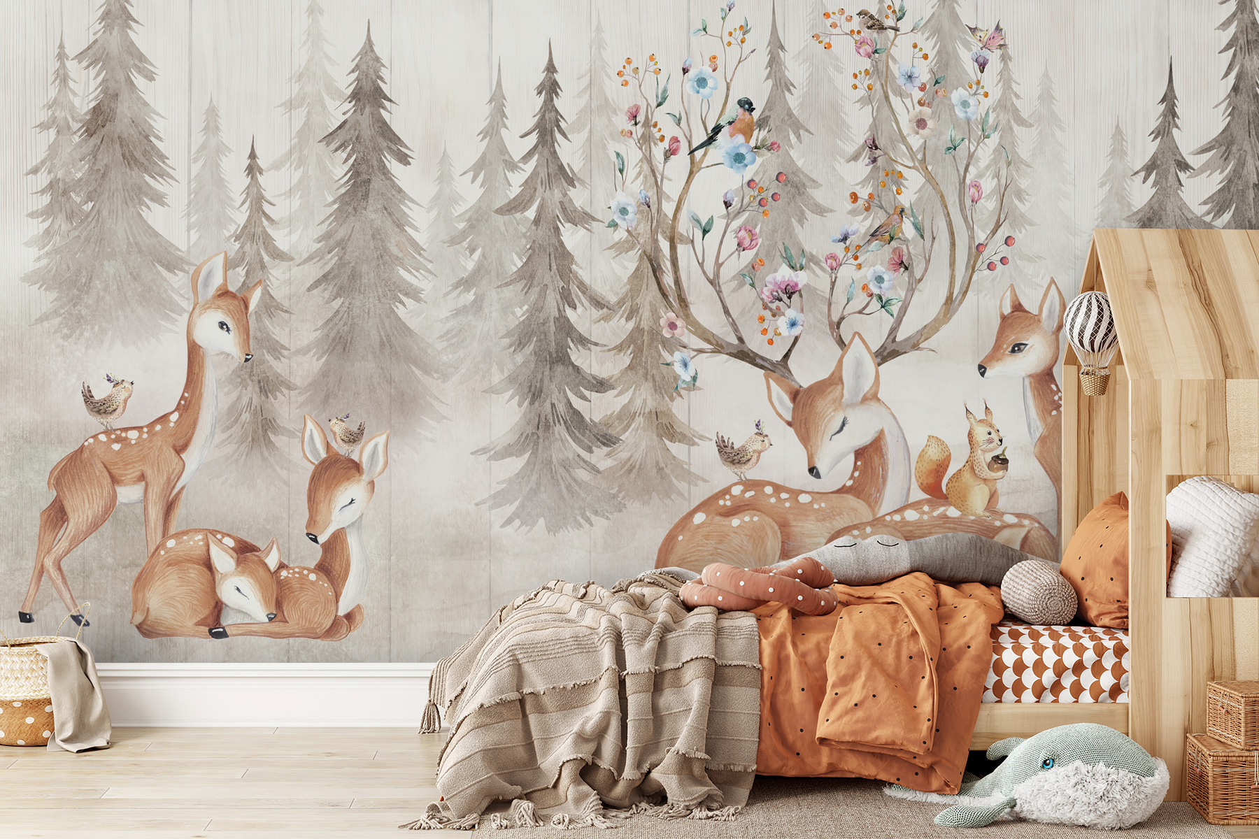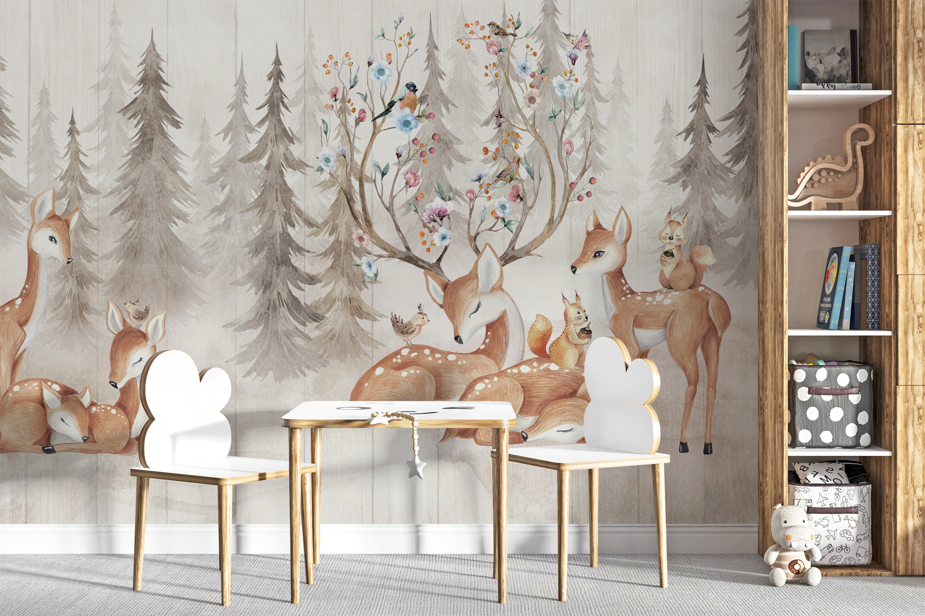 Imaginez que vous pénétrez chaque jour dans un rêve sylvestre – quel enchantement ! Cette peinture murale “Oiseau assis sur un cerf” ressemble à un livre d’histoires qui prendrait vie. Le cerf délicat et les charmants oiseaux créent une scène tout droit sortie d’une forêt douillette et magique. Parfait pour une chambre d’enfant, il apporte un sentiment d’émerveillement et de paix.