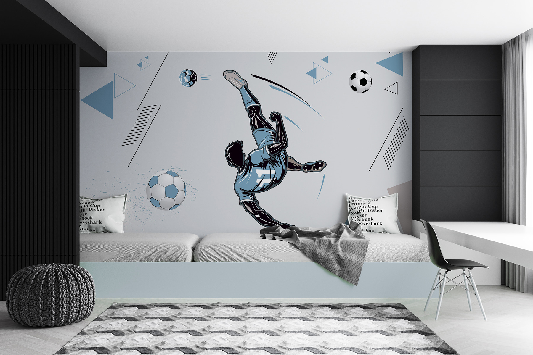C’est un choix fantastique pour une salle de jeux, une chambre d’adolescent ou même un salon où l’on veut garder l’esprit vif. De plus, le mélange de formes géométriques modernes en arrière-plan ajoute une touche artistique cool. Les amis entreront dans la pièce et ressentiront une poussée d’excitation, comme s’ils entendaient la foule rugir lors d’un grand match.