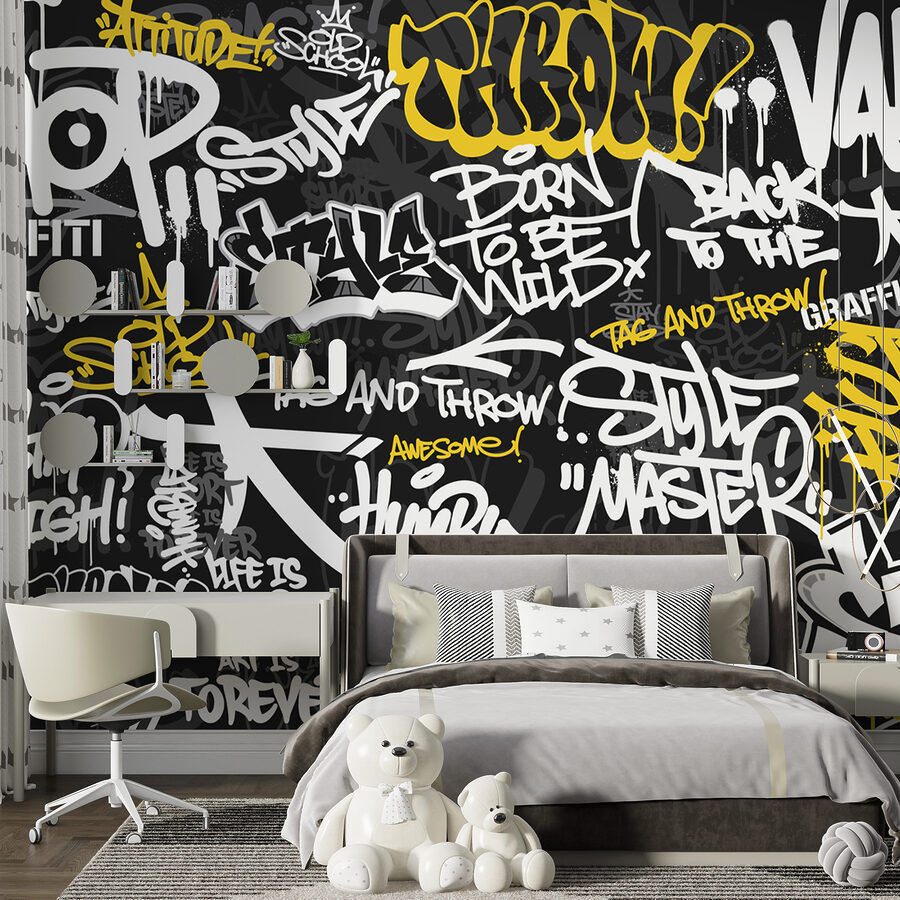 Cette peinture murale, “Graffiti jaune sur fond noir”, fait vibrer. Il est parfait pour ajouter une touche de fraîcheur urbaine à n’importe quel espace. Imaginez que la chambre de votre ado ressemble soudain à une ruelle du centre-ville, dans le meilleur des cas – pleine d’énergie juvénile et d’esprit rebelle. C’est comme faire entrer l’art de la rue à l’intérieur sans les vapeurs de peinture en aérosol ! De plus, le mélange de jaune et de noir est vraiment frappant et ajoute cette touche inattendue qui peut réveiller une pièce. Étonnamment sophistiquée tout en restant totalement fraîche, cette peinture murale est parfaite pour les jeunes, ou les jeunes de cœur, qui veulent que leurs murs en disent long.