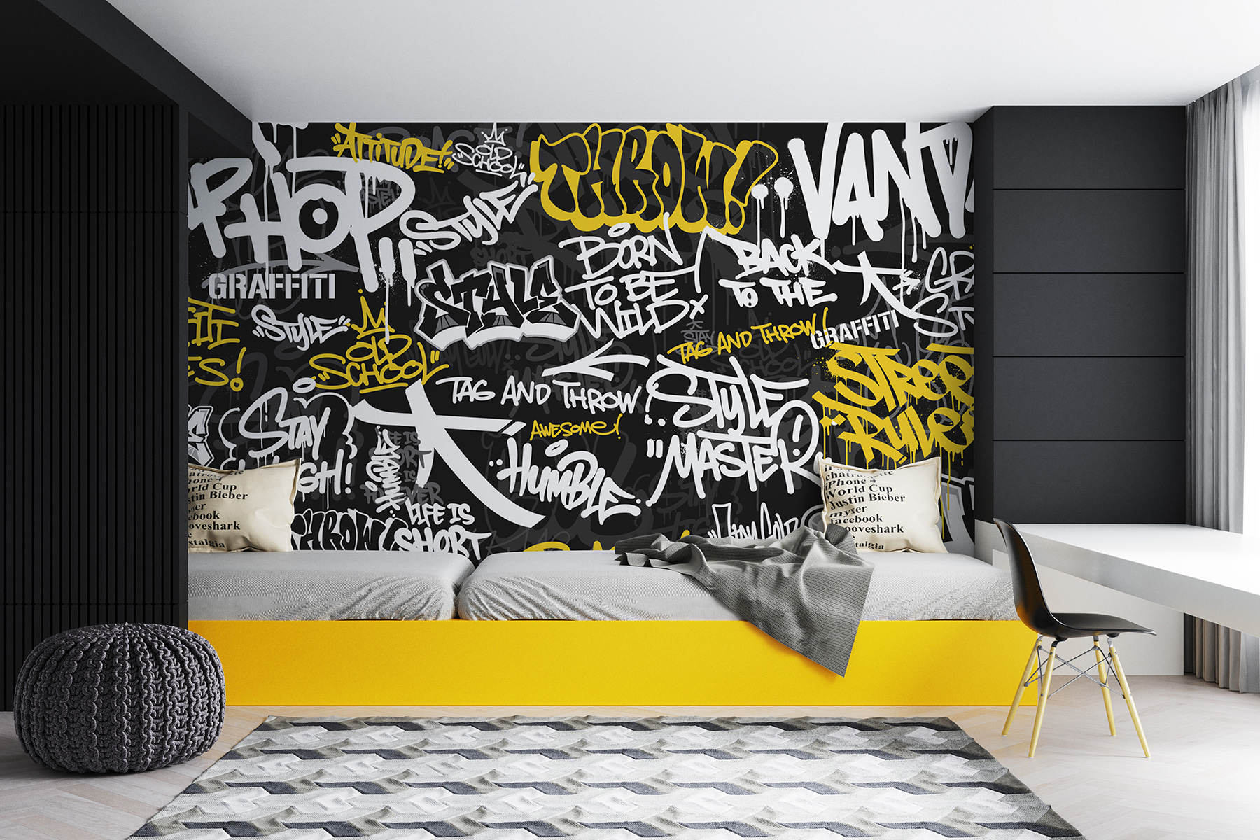 Cette peinture murale, “Graffiti jaune sur fond noir”, fait vibrer. Il est parfait pour ajouter une touche de fraîcheur urbaine à n’importe quel espace. Imaginez que la chambre de votre ado ressemble soudain à une ruelle du centre-ville, dans le meilleur des cas – pleine d’énergie juvénile et d’esprit rebelle. C’est comme faire entrer l’art de la rue à l’intérieur sans les vapeurs de peinture en aérosol ! De plus, le mélange de jaune et de noir est vraiment frappant et ajoute cette touche inattendue qui peut réveiller une pièce. Étonnamment sophistiquée tout en restant totalement fraîche, cette peinture murale est parfaite pour les jeunes, ou les jeunes de cœur, qui veulent que leurs murs en disent long.
