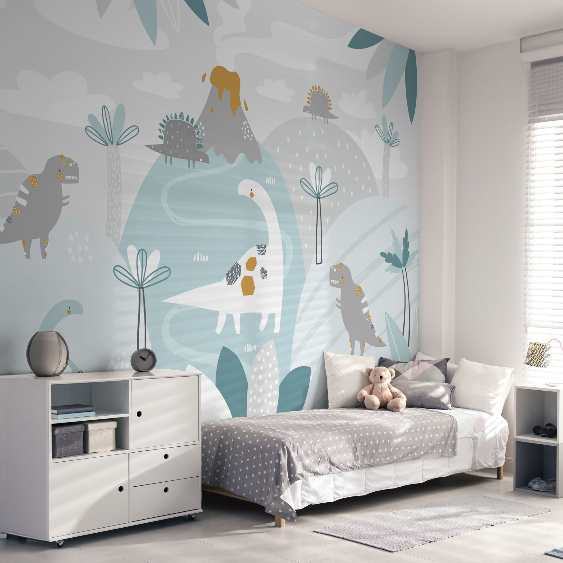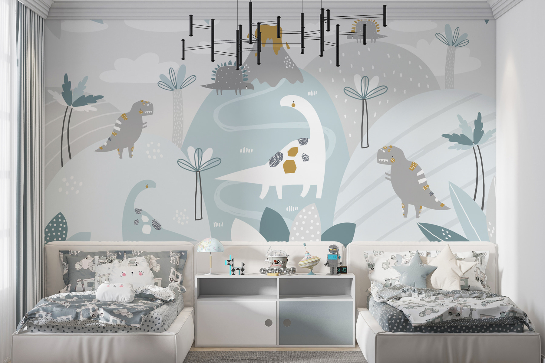 Vous avez déjà songé à retourner à l’âge des dinosaures, mais, vous savez, tout en restant dans votre petit coin douillet ? Cette peinture murale est faite pour vous ! Avec sa toile de fond bleue et blanche apaisante parsemée de points blancs fantaisistes, elle donne l’impression d’un paysage de rêve où les dinosaures amusants se promènent en toute liberté. Imaginez votre enfant se réveiller tous les matins avec un sympathique brachiosaure qui lui dit “bonjour” – sourires instantanés garantis !