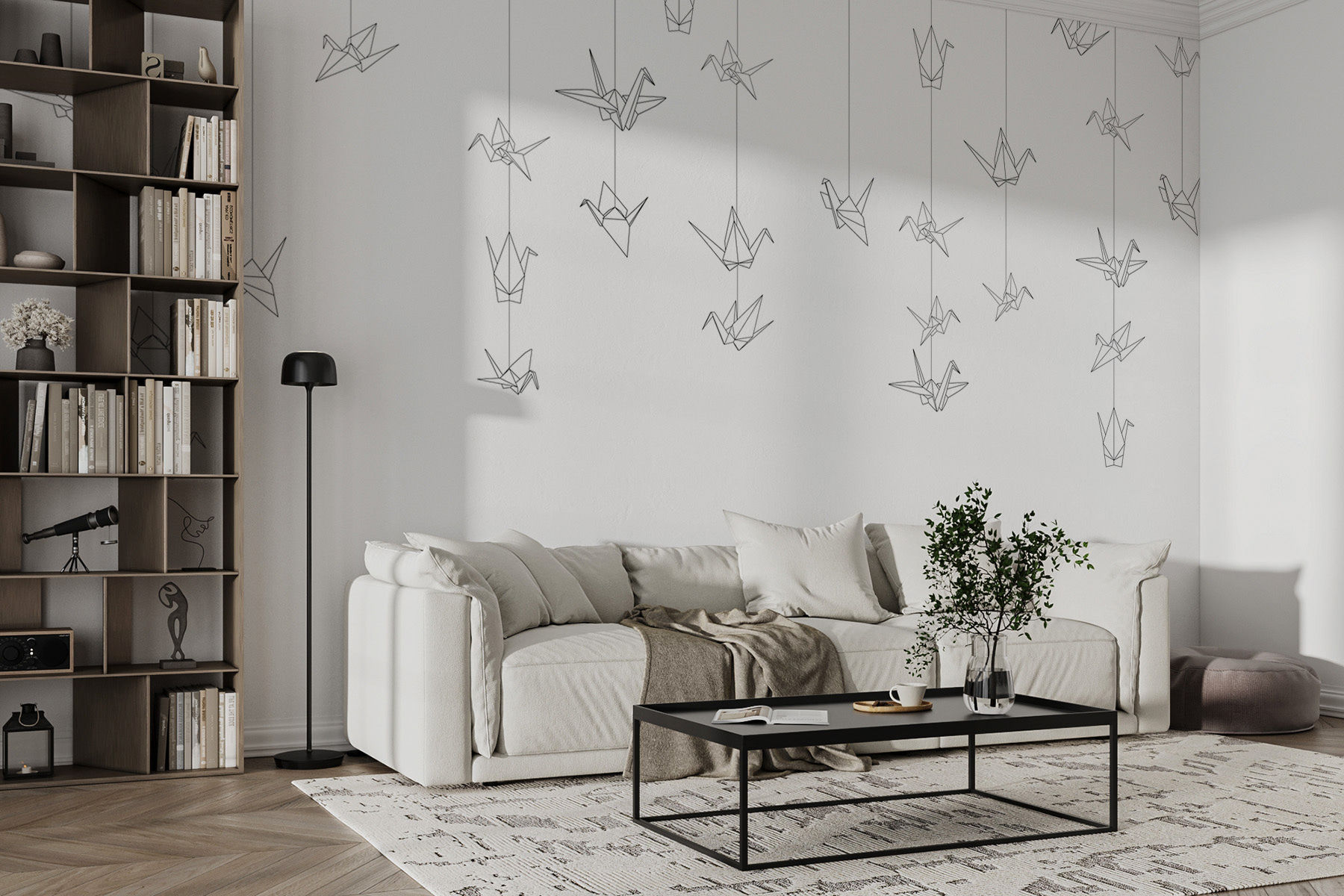 Vous avez déjà pensé à donner une touche artistique à vos murs avec un minimum d’effort ? Jetez un coup d’œil à cette peinture murale d’oiseaux en noir et blanc. C’est comme si vous aviez un morceau de votre carnet de croquis préféré agrandi à la taille réelle. Les lignes simples lui confèrent une ambiance élégante et moderne. Imaginez-la dans votre salon ou votre espace de travail – le genre d’œuvre qui vous fait prendre une minute pour respirer et vous détendre. De plus, il y a quelque chose de très apaisant dans ces grues en papier qui pendent doucement, comme si elles étaient en vol. C’est le mélange parfait d’artistique et de zen. Si vous avez un penchant pour la décoration unique qui suscite la joie (oui, un moment Marie Kondo), cette peinture murale est tout à fait dans vos cordes.