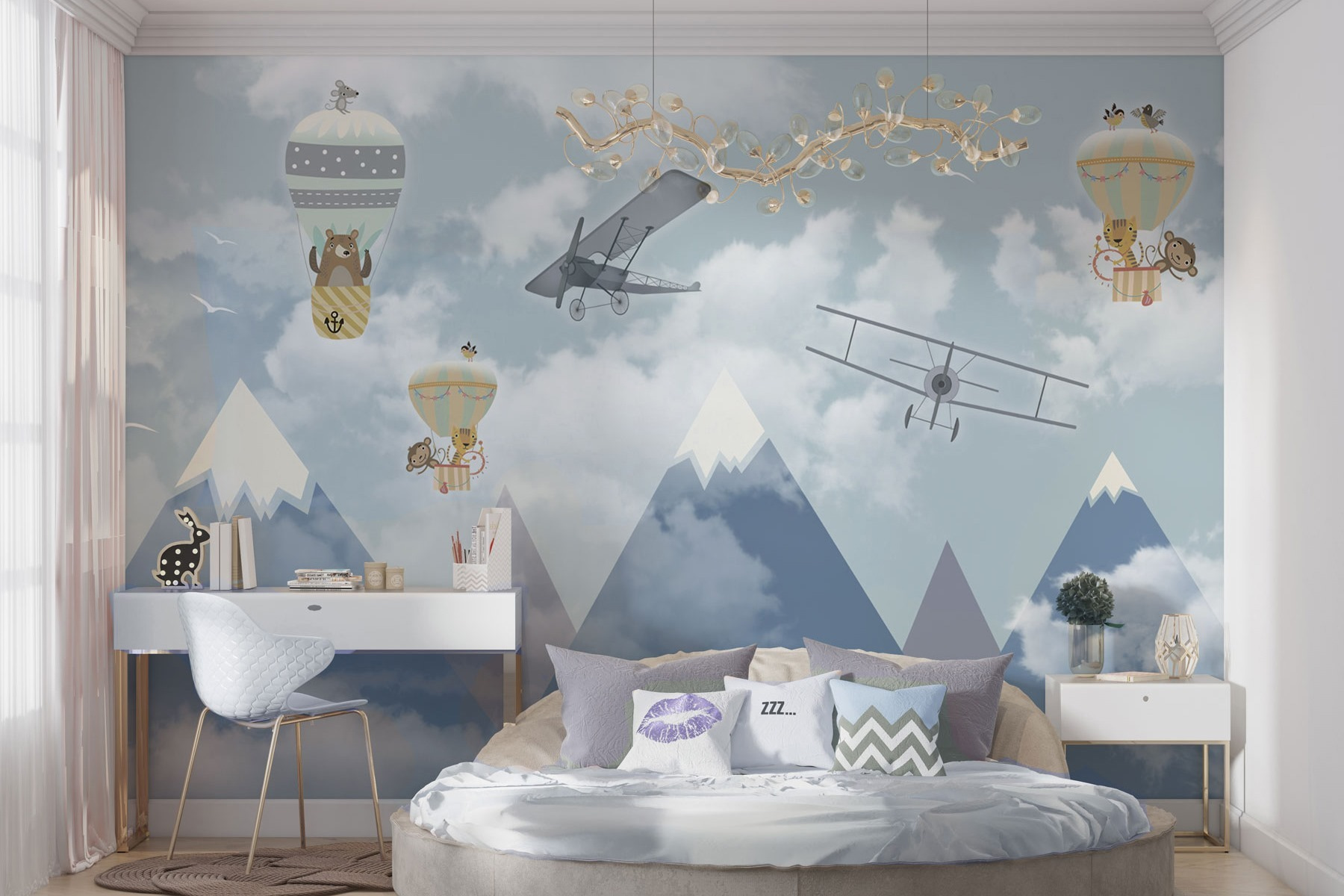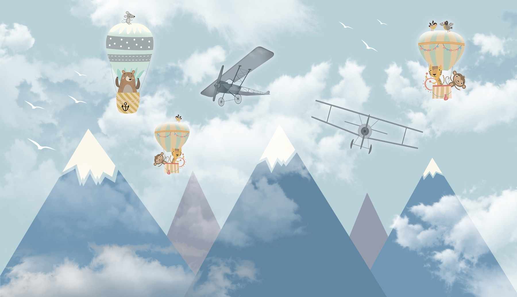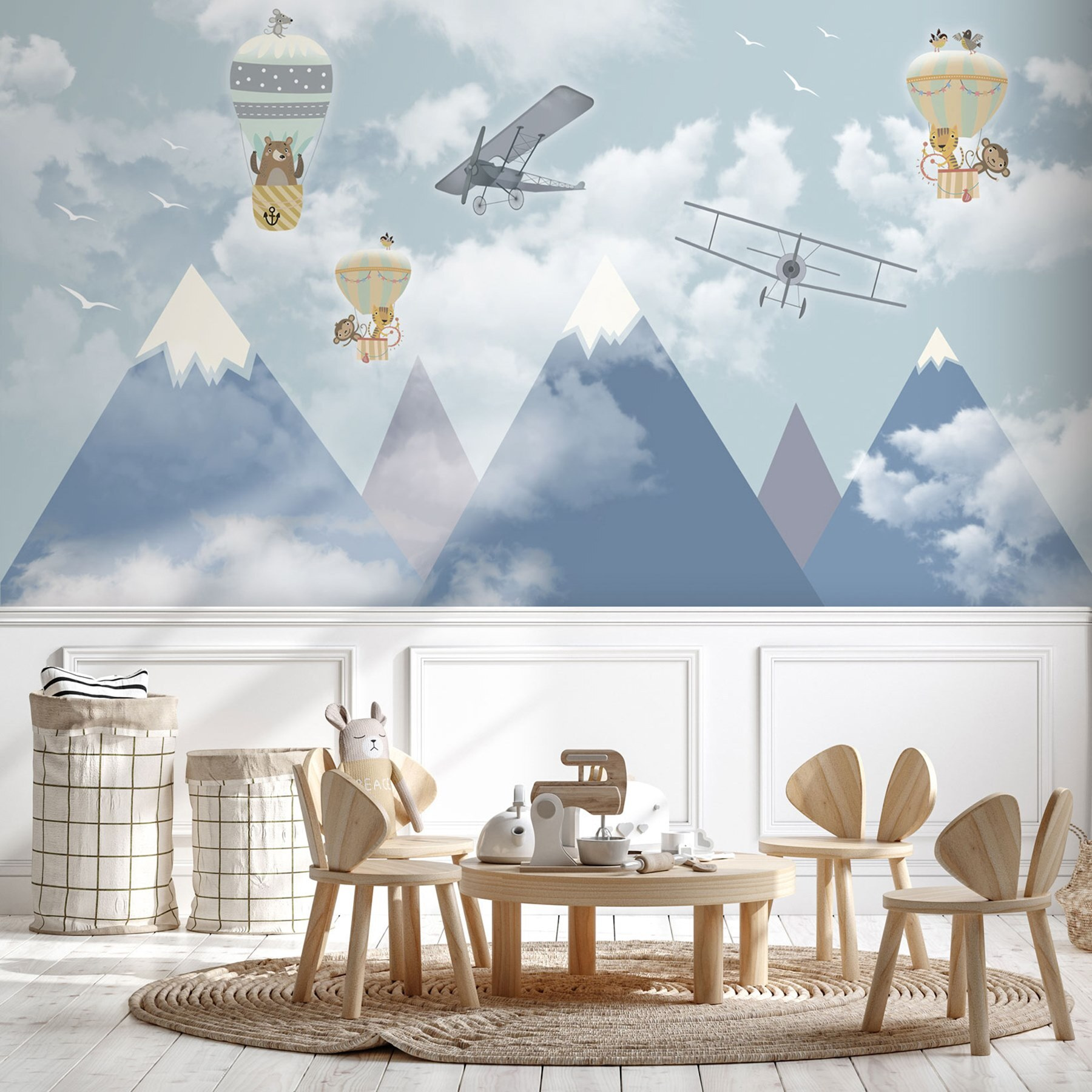 Cette ravissante peinture murale, représentant un groupe fantaisiste de montgolfières et d’avions ludiques s’envolant dans un ciel de rêve, crée une atmosphère charmante dans n’importe quel espace. Imaginez vos enfants contemplant leur nouveau mur, leur imagination s’envolant aux côtés d’ours sympathiques et de créatures curieuses. C’est comme si vous invitiez un peu d’aventure dans votre maison ! Les bleus tendres et les blancs doux ajoutent une touche apaisante, parfaite pour les chambres d’enfants ou les aires de jeux. Qui ne rêverait pas d’explorer le ciel chaque nuit ? Ce n’est qu’une peinture murale, mais c’est aussi une porte ouverte sur des aventures sans fin.