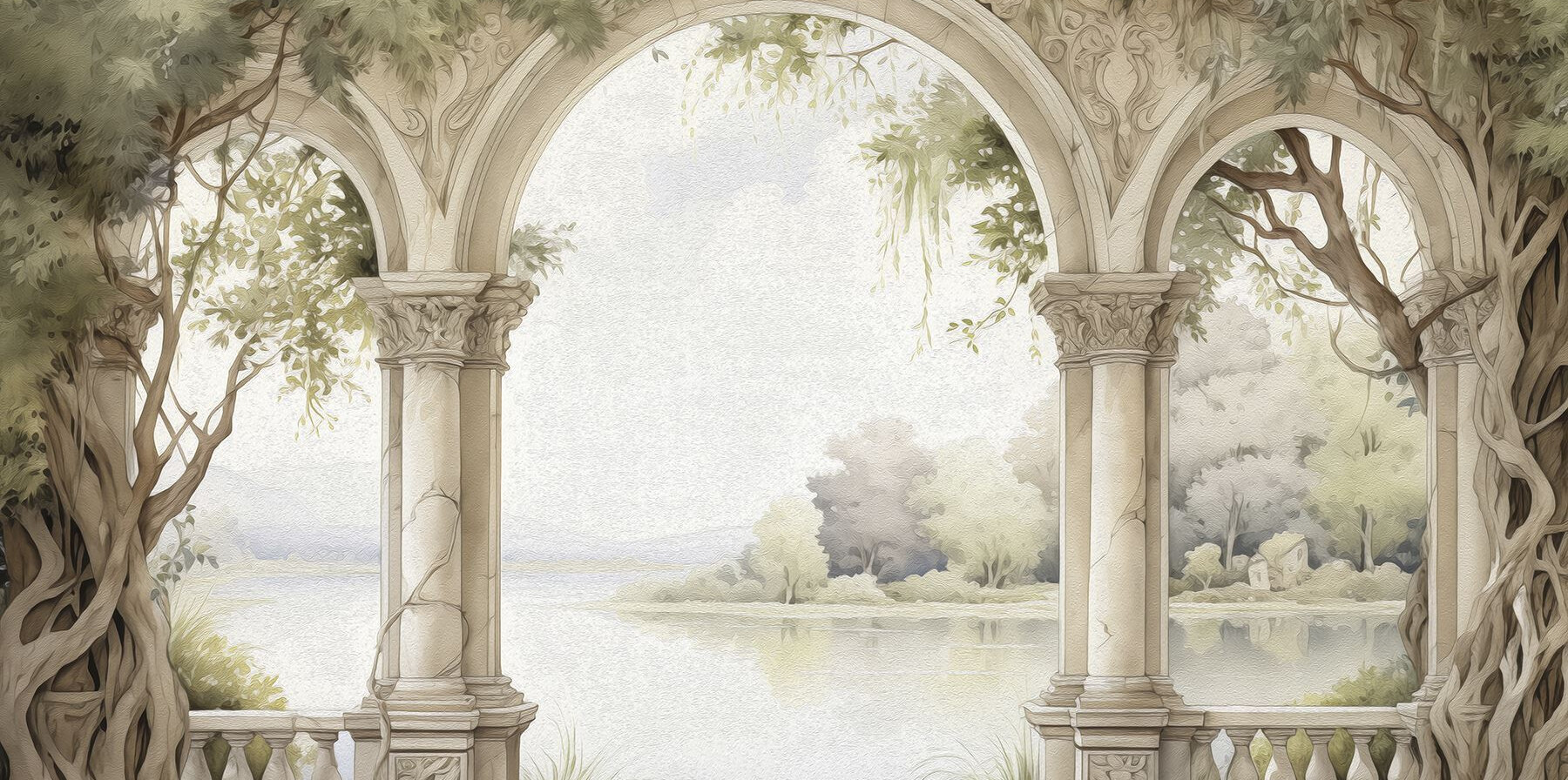 Papier peint Aquarelle d'une arche en pierre avec des arbres et un lac