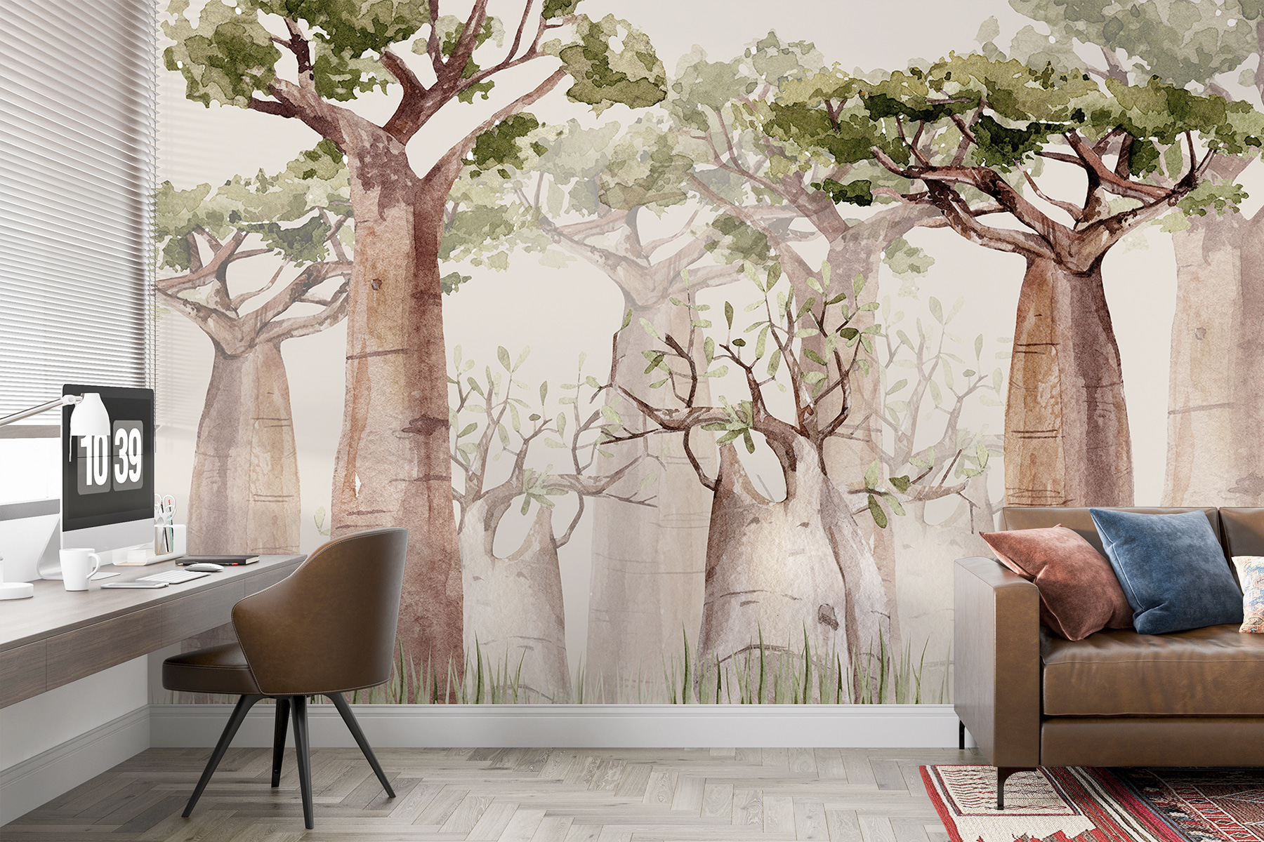 Plongez dans un paysage de rêve avec la peinture murale “Majestic Baobabs in Watercolor Forest”, parfaite pour transformer n’importe quel espace en une forêt fantaisiste. Imaginez que vous entrez dans une pièce où ces baobabs imposants vous accueillent avec leur charme doux et aquarellé. Les enfants l’adoreraient, se sentant comme des mini explorateurs dans une forêt luxuriante et magique. Les teintes douces apportent une touche de confort et de nature tout en ajoutant un peu de mysticisme. Imaginez une chambre d’enfant ou une salle de jeux transformée en une retraite enchanteresse ; c’est comme si l’heure du conte venait d’être améliorée. Les verts doux et les tons terreux sont très apaisants, ce qui les rend idéaux pour un coin lecture ou même comme toile de fond pour la relaxation quotidienne. C’est exactement ce qu’il faut pour tous ceux qui souhaitent apporter une touche tropicale et une touche de créativité dans leur maison. Préparez-vous à recevoir tous les compliments et peut-être même quelques “ooh” et “aah” !