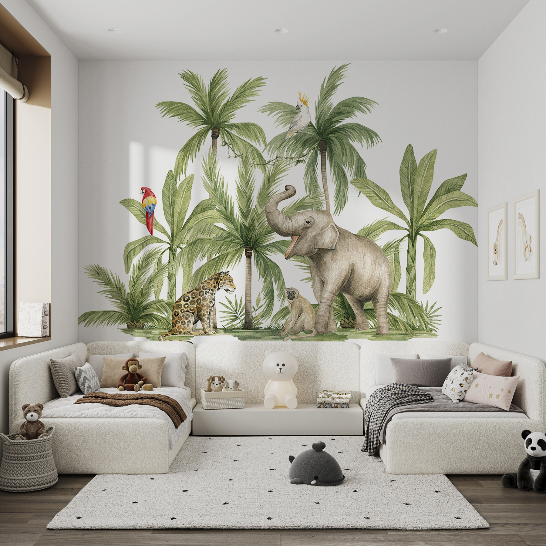 Transformez n’importe quelle pièce en une vibrante aventure dans la jungle grâce à cette peinture murale fantaisiste représentant des animaux enjoués parmi des palmiers qui se balancent. Imaginez que vous entrez dans un espace où un éléphant, un singe effronté et un perroquet coloré vous accueillent – qui ne sourirait pas à cela ? Parfait pour les chambres d’enfants ou même pour un coin confortable de votre espace de vie, il ajoute une touche de charme à la nature. De plus, qui pourrait résister à l’ambiance apaisante d’une verdure luxuriante ? Installez-vous confortablement et laissez cette scène de jungle susciter la joie et le rire, transformant les moments quotidiens en mini-aventures. Adoptez le côté sauvage, ne serait-ce que pour un instant !