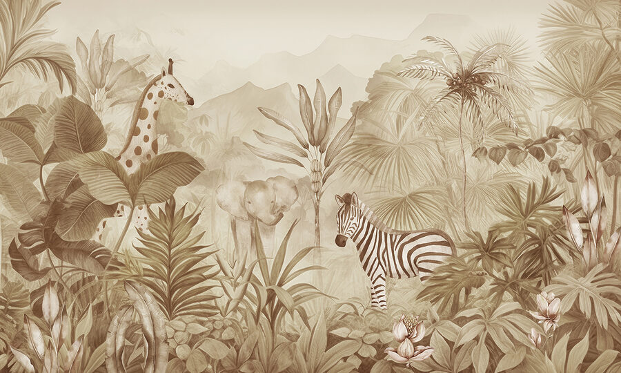 Imaginez transformer une pièce en un pays des merveilles de la jungle – oui, c’est ce que fait ce “Murals Jungle Animals in Sepia Tones” (muraux animaux de la jungle dans des tons sépia) ! Avec ses douces teintes sépia, c’est comme si vous entriez dans une photographie apaisante et ancienne d’animaux sauvages exotiques. Parfaite pour une chambre d’enfant ou un coin à thème nature, cette peinture murale représente tous les animaux, des zèbres aux girafes, et se fond dans un paysage luxuriant et verdoyant.