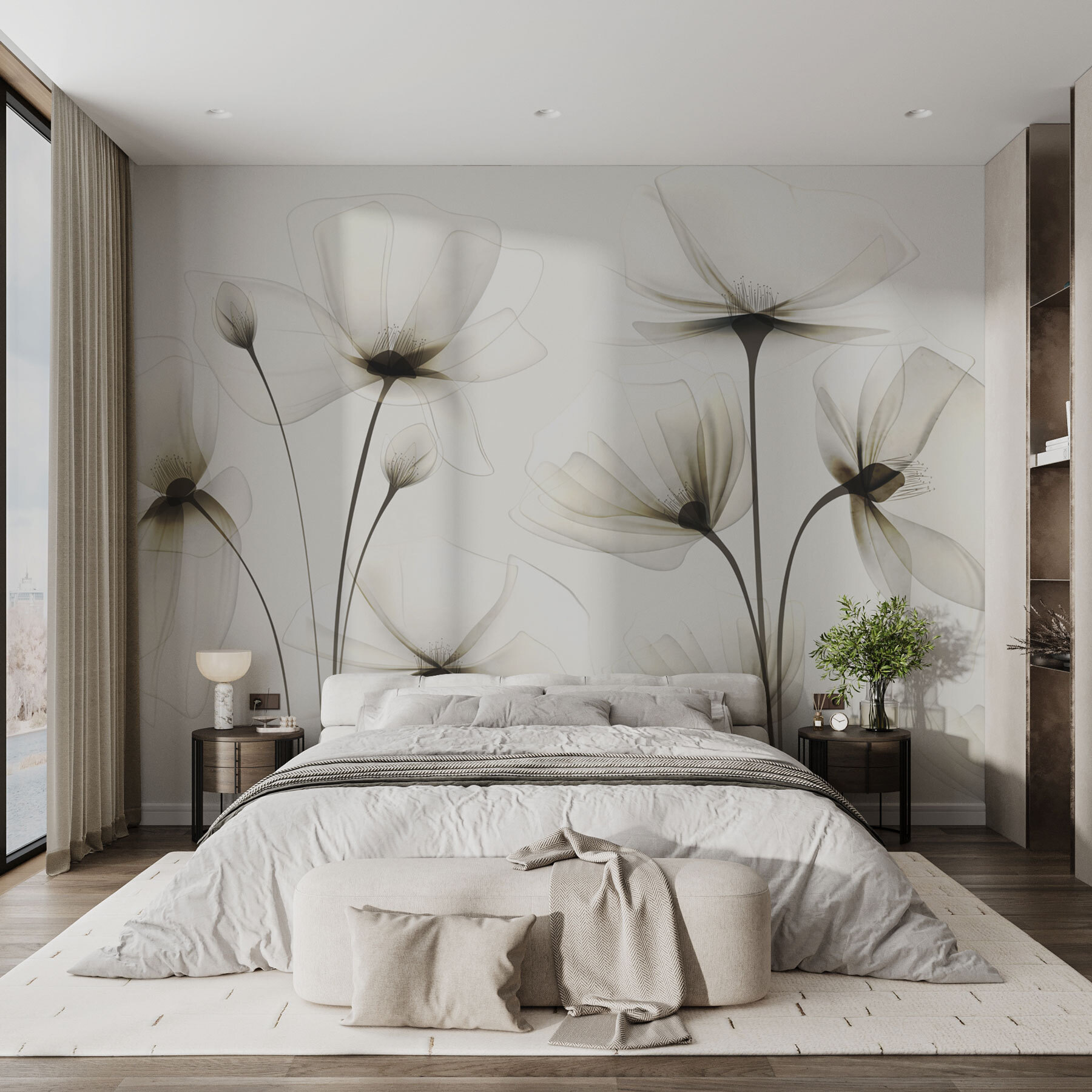 Vos murs ont besoin d’un peu de magie ? Jetez un coup d’œil à cette peinture murale avec ces fleurs si délicates qui semblent presque flotter dans l’air. Les pétales doux et transparents sur une toile de fond blanche dégagent une atmosphère sereine et apaisante. Imaginez que vous vous réveillez tous les jours devant cette beauté, comme si vous aviez votre propre jardin paisible sans avoir à l’arroser.