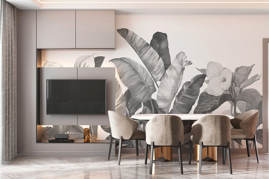 Imaginez que vous entrez dans une pièce et que vous vous retrouvez dans votre propre paradis tropical. C’est ce que fait cette peinture murale. “Feuilles et fleurs tropicales monochromes” n’est pas seulement un nom, c’est toute une ambiance. Pensez-y : des feuilles de bananier audacieuses se mêlent à des fleurs exotiques, le tout dans une échelle de gris apaisante qui, d’une certaine manière, donne une impression de calme et de classe. Parfait pour tous ceux qui aiment la jungle mais peuvent se passer des moustiques, n’est-ce pas ?