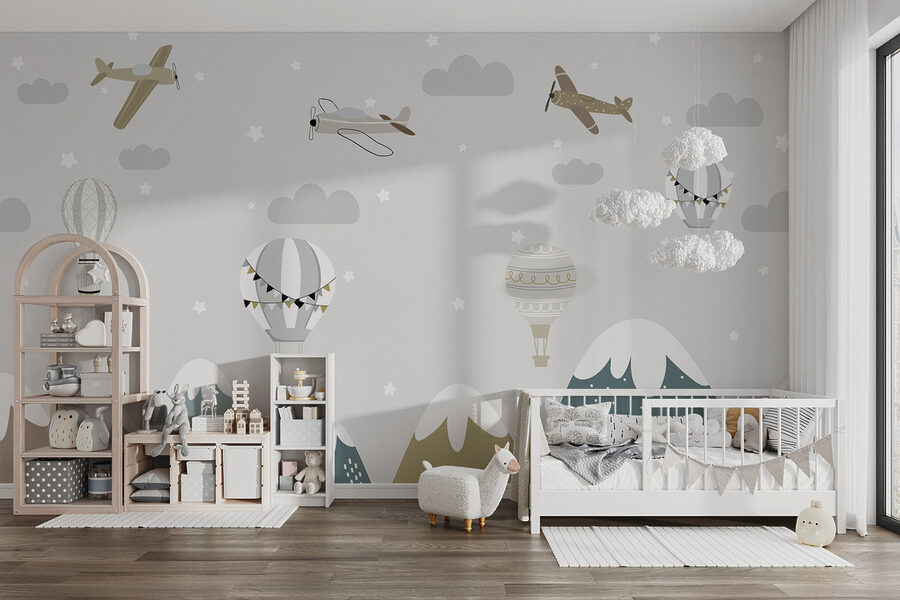 Parfait pour une chambre d’enfant ou une salle de jeux, il ajoute une touche d’aventure et beaucoup de charme. Les petits avions semblent prêts à emmener votre enfant dans un voyage aérien, tandis que les montgolfières flottent doucement, ajoutant un sentiment de sérénité. Cette peinture murale ne se contente pas de décorer, elle raconte une histoire.