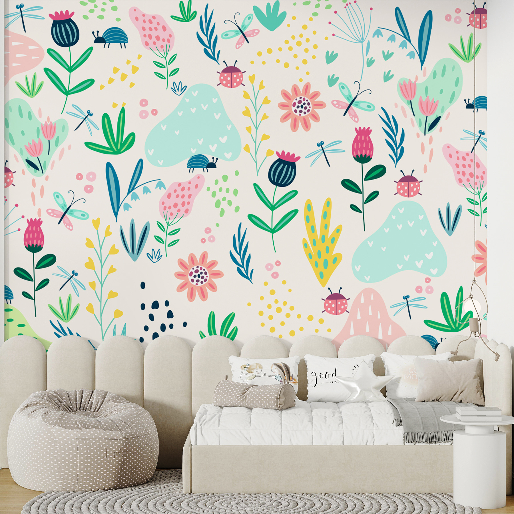 Vos murs ont besoin d’un peu de magie ? Cet imprimé “Papier peint Cartoon of a Ladybug” pourrait bien être votre nouveau meilleur ami. Parfait pour embellir une chambre d’enfant ou ajouter une touche fantaisiste à votre propre espace, c’est comme une mini-aventure dans la jungle à chaque fois que vous y pénétrez. De mignonnes coccinelles, de sympathiques libellules et des fleurs colorées dansent ensemble dans une scène ludique.