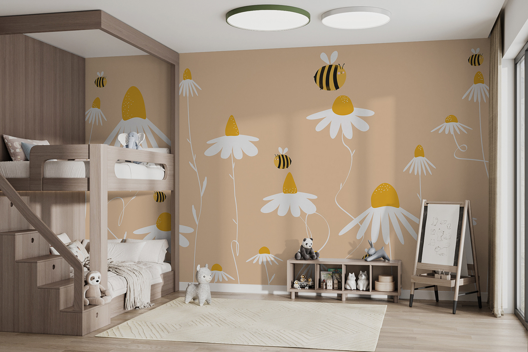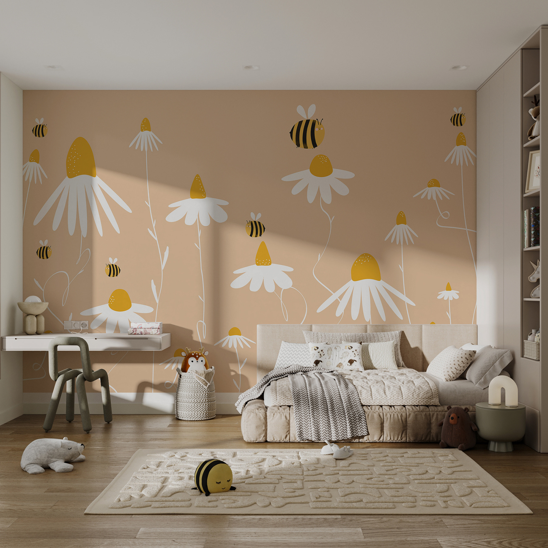 Et ces petites abeilles sympathiques qui bourdonnent autour de nous – trop mignonnes, n’est-ce pas ? Elles ajoutent une touche charmante qui donne l’impression d’être vivante et bourdonnante d’énergie. Que vous soyez jeune ou jeune de cœur, cette peinture murale a ce charme incomparable qui transforme n’importe quelle pièce de “moche” en “merveilleuse”.