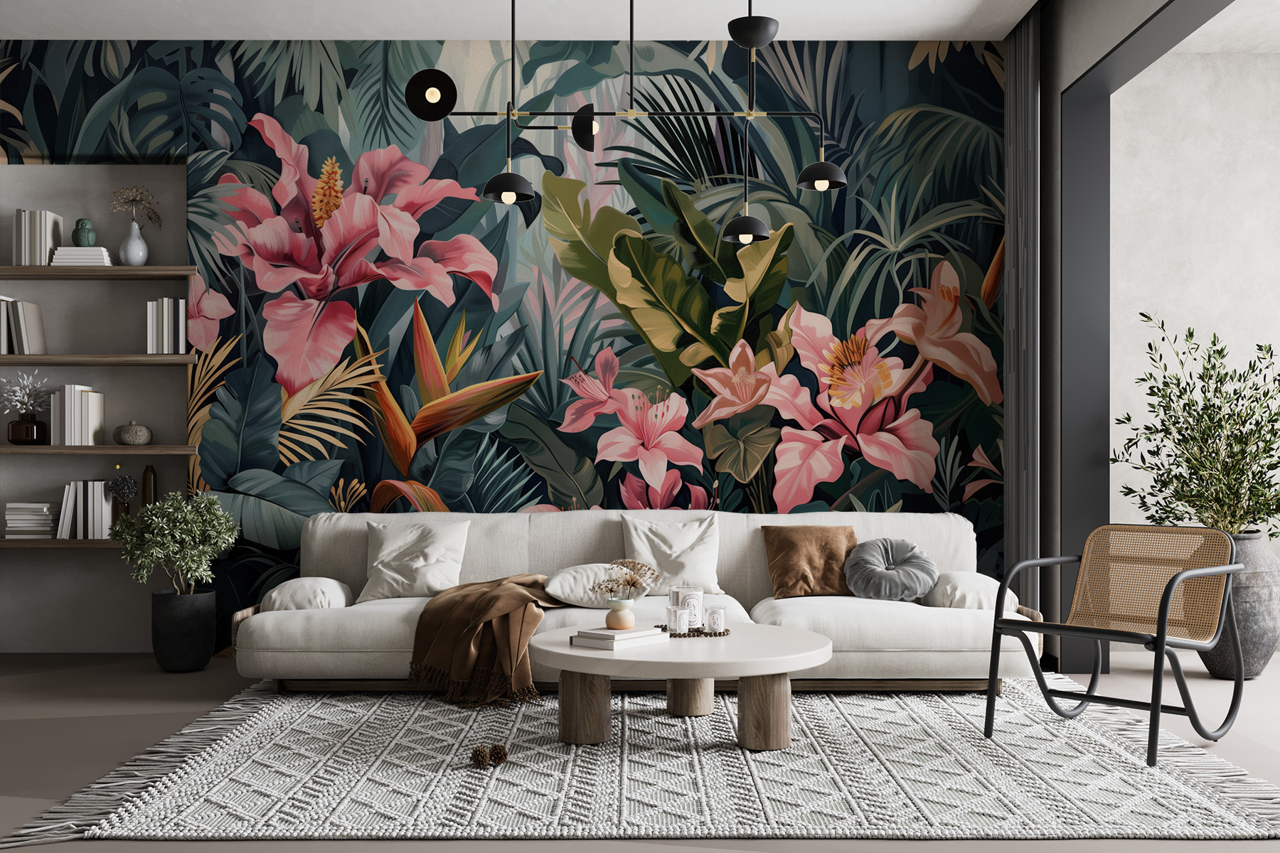 Imaginez que vous rentriez chez vous après une longue journée, que vous enleviez vos chaussures et que vous soyez accueilli par une jungle luxuriante dans votre salon. C’est exactement ce que cette peinture murale vibrante apporte. C’est comme si vous pénétriez dans un paradis tropical – avec des fleurs roses audacieuses et une riche verdure – sans quitter votre maison ! Parfait pour ajouter un facteur de surprise à n’importe quel espace, qu’il s’agisse d’un salon, d’une chambre à coucher ou même d’un bureau à domicile chic.