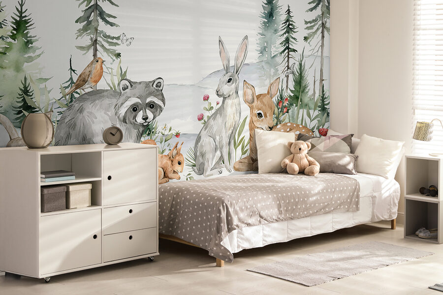 Transformez votre espace avec cette peinture murale enchanteresse représentant un charmant groupe d’animaux de la forêt. Imaginez de gentils cerfs qui se prélassent, des lapins vifs qui sautillent et un raton laveur curieux qui jette un coup d’œil derrière une verdure luxuriante. C’est comme si vous rameniez une petite partie de la nature à l’intérieur, la saleté et les insectes en moins. Les teintes douces de l’aquarelle créent une atmosphère apaisante, parfaite pour les salons, les chambres d’enfants ou tout autre coin douillet. Imaginez que vous sirotiez votre café du matin pendant qu’un lapin semble partager vos pensées ou qu’un écureuil vous amuse avec ses pitreries. Il ne s’agit pas seulement d’une peinture murale, mais d’un rappel quotidien à apprécier les joies simples de la vie, comme les animaux mignons et les moments de tranquillité. Laissez donc cette charmante équipe ajouter une touche chaleureuse à vos murs, invitant des sourires et une pincée de fantaisie dans chaque journée.