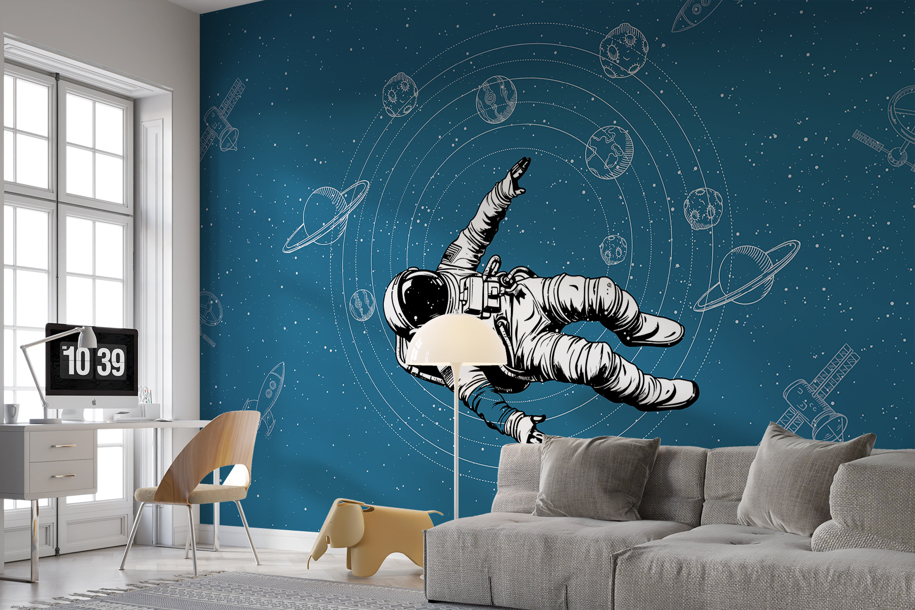 Ajoutez du piquant à votre espace avec cette peinture murale “Astronaute flottant dans l’espace”, qui fait partie de notre collection de peintures murales “Galaxie”. Imaginez que vous plongez dans le cosmos à chaque fois que vous entrez dans la pièce. La toile de fond bleu profond, parsemée d’étoiles et de planètes, est parfaite pour ajouter un sentiment d’aventure et d’émerveillement à n’importe quel mur. Qu’il s’agisse d’une chambre d’enfant où les rêves de voyage dans l’espace prennent vie ou de votre refuge personnel, cette peinture murale apporte de la sérénité et une touche de magie. Imaginez-vous en train de faire une pause dans une journée trépidante et de flotter, en apesanteur, parmi les galaxies. L’évasion à l’état pur, sur votre mur !