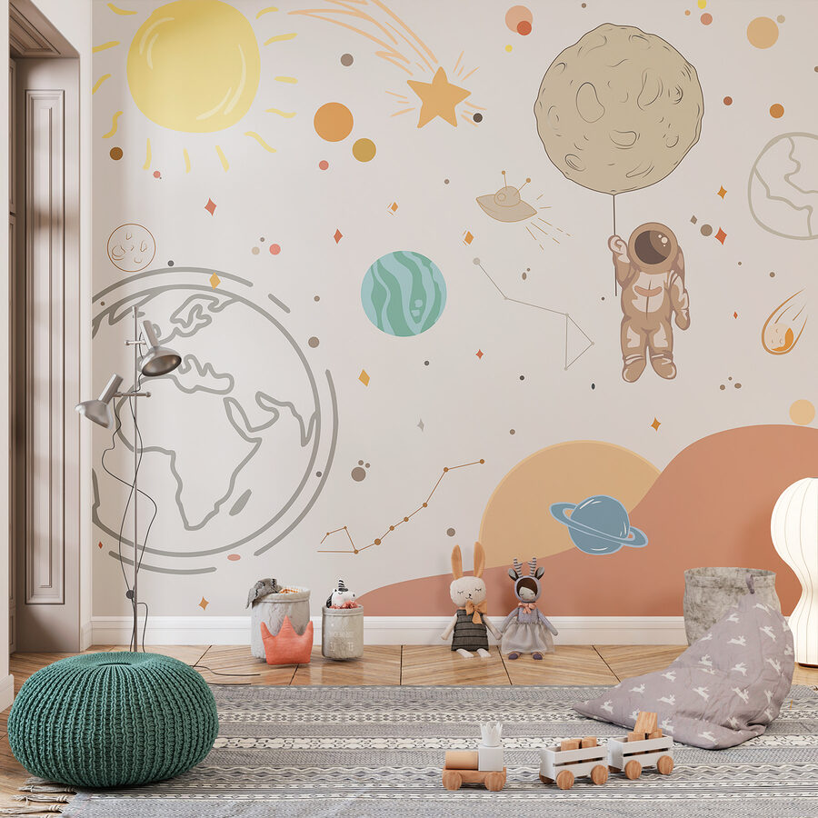 Imaginez que vous contemplez un univers onirique et fantaisiste sans quitter votre salon. Cette “peinture murale Dessin animé d’une planète” est parfaite pour tous ceux qui aiment la galaxie et ont un faible pour les adorables dessins d’astronautes. Le dessin est ludique et regorge de planètes, d’étoiles et même d’un joyeux petit voyageur de l’espace qui s’accroche à un ballon ressemblant à une lune. Il est parfait pour pimenter une chambre d’enfant ou pour ajouter un peu de charme cosmique à n’importe quel espace. Il ne s’agit pas seulement d’une peinture murale, mais d’une ambiance à part entière. Vous aurez l’impression de flotter dans une galaxie douce et cartoonesque.