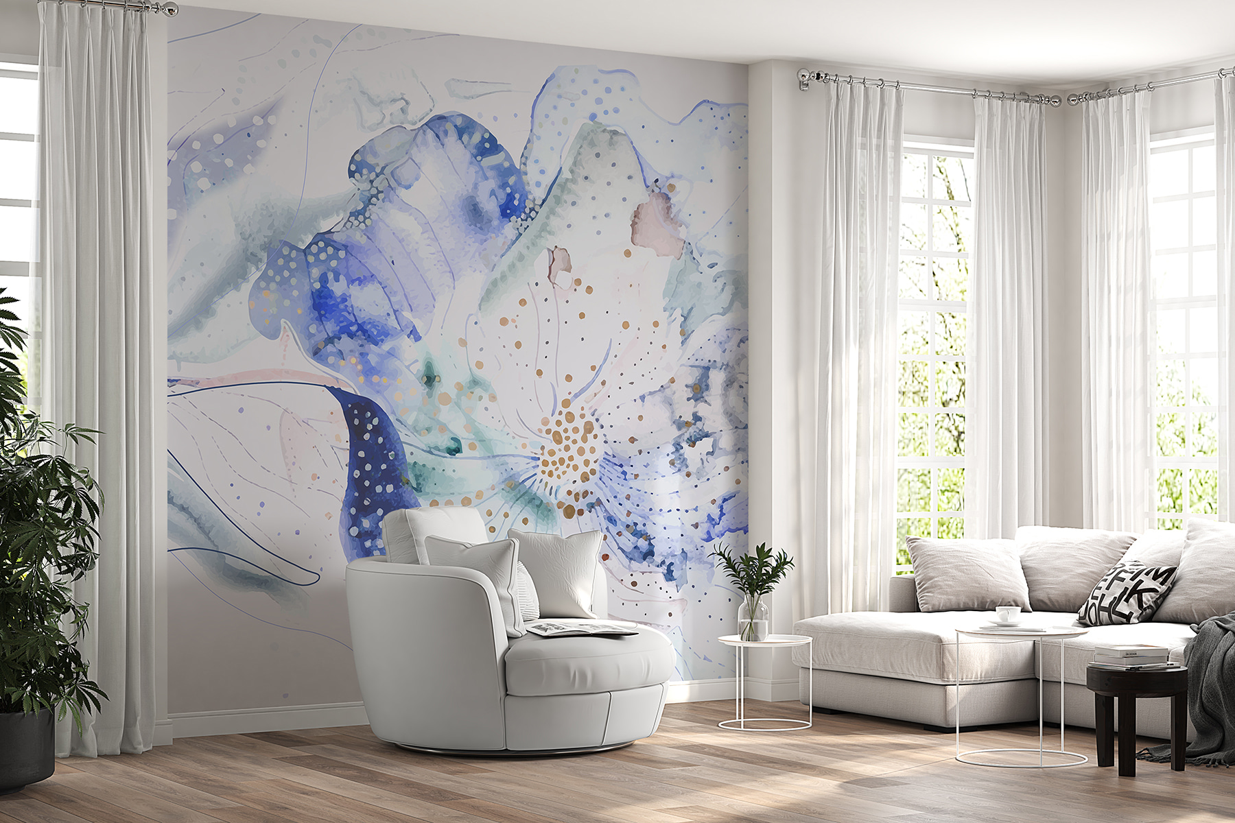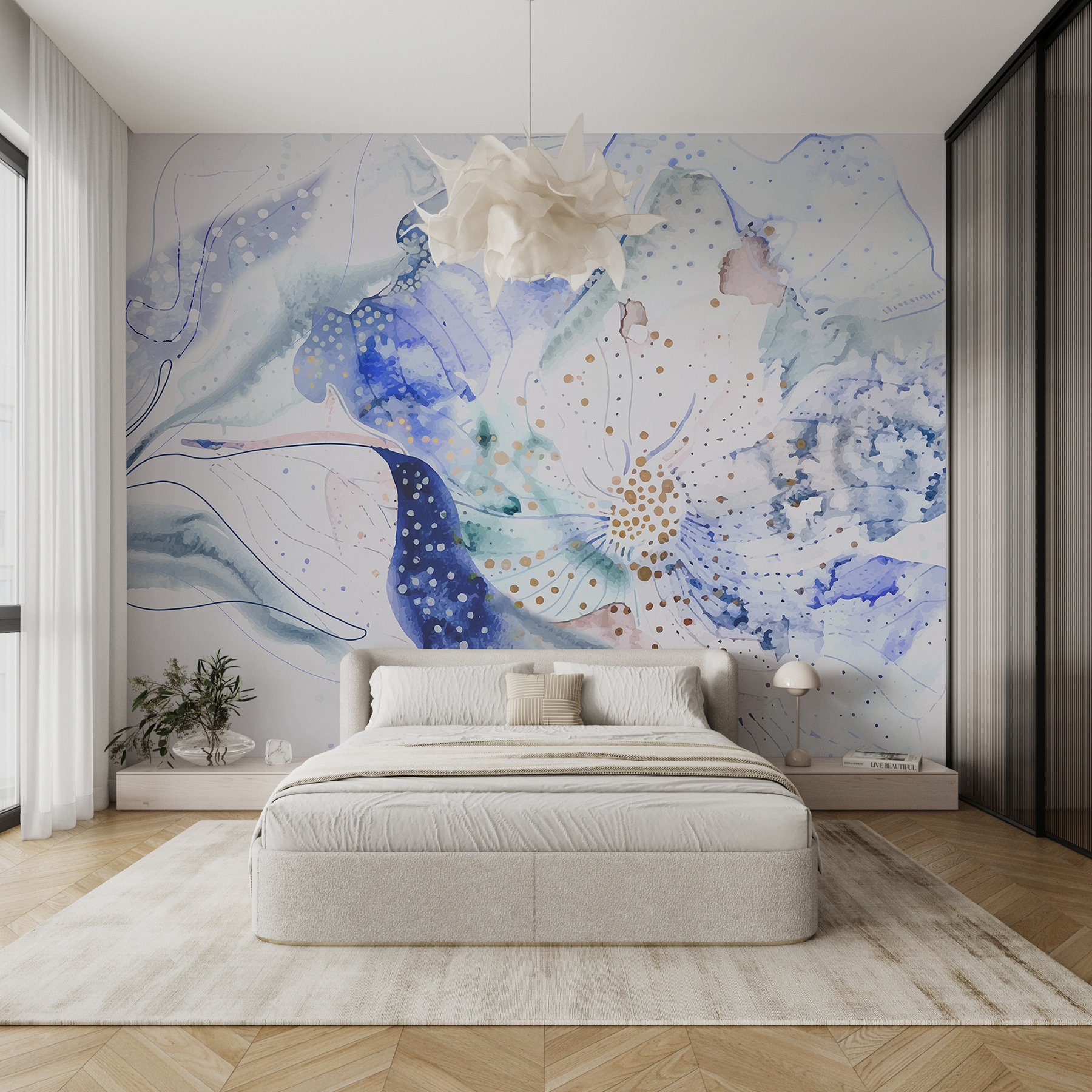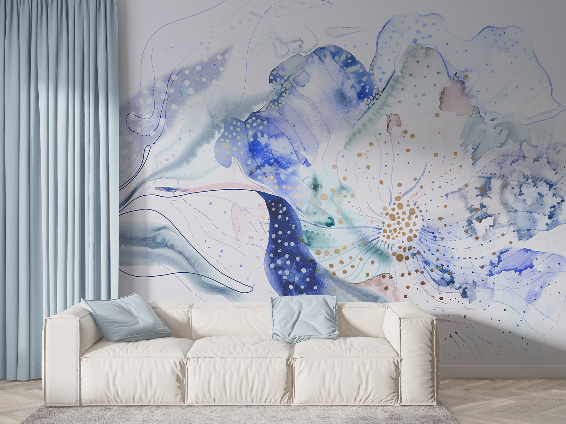 Transformez n’importe quel espace avec cette superbe peinture murale qui donne l’impression de pénétrer dans un jardin serein regorgeant de fleurs délicates. Les douces teintes bleues de l’aquarelle apportent une sérénité calme qui est parfaite pour égayer une pièce ou créer un coin douillet. Imaginez-vous en train de vous blottir dans un bon livre, les douces vibrations florales vous enveloppant comme une étreinte chaleureuse. C’est comme apporter une bouffée d’air frais à l’intérieur, les allergies en moins. Les doux tourbillons et les points ludiques de cette peinture murale dansent sur le mur, invitant à l’émerveillement et à la réflexion. Une petite touche de nature – qui n’aimerait pas cela ?