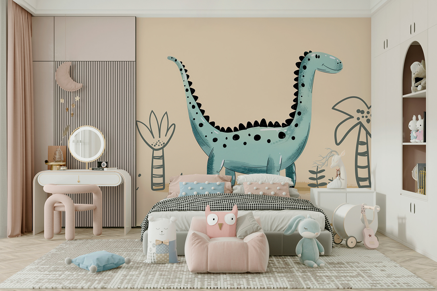 Imaginez que vous vous réveillez chaque matin avec cette joyeuse créature… c’est comme si vous commenciez votre journée par un joyeux câlin ! Et ces minuscules plantes et palmiers ? Ils ne font qu’ajouter à l’ambiance de jungle préhistorique – c’est mignon, non ? C’est le genre de peinture murale qui peut transformer un mur ennuyeux en une charmante scène de livre d’histoires.