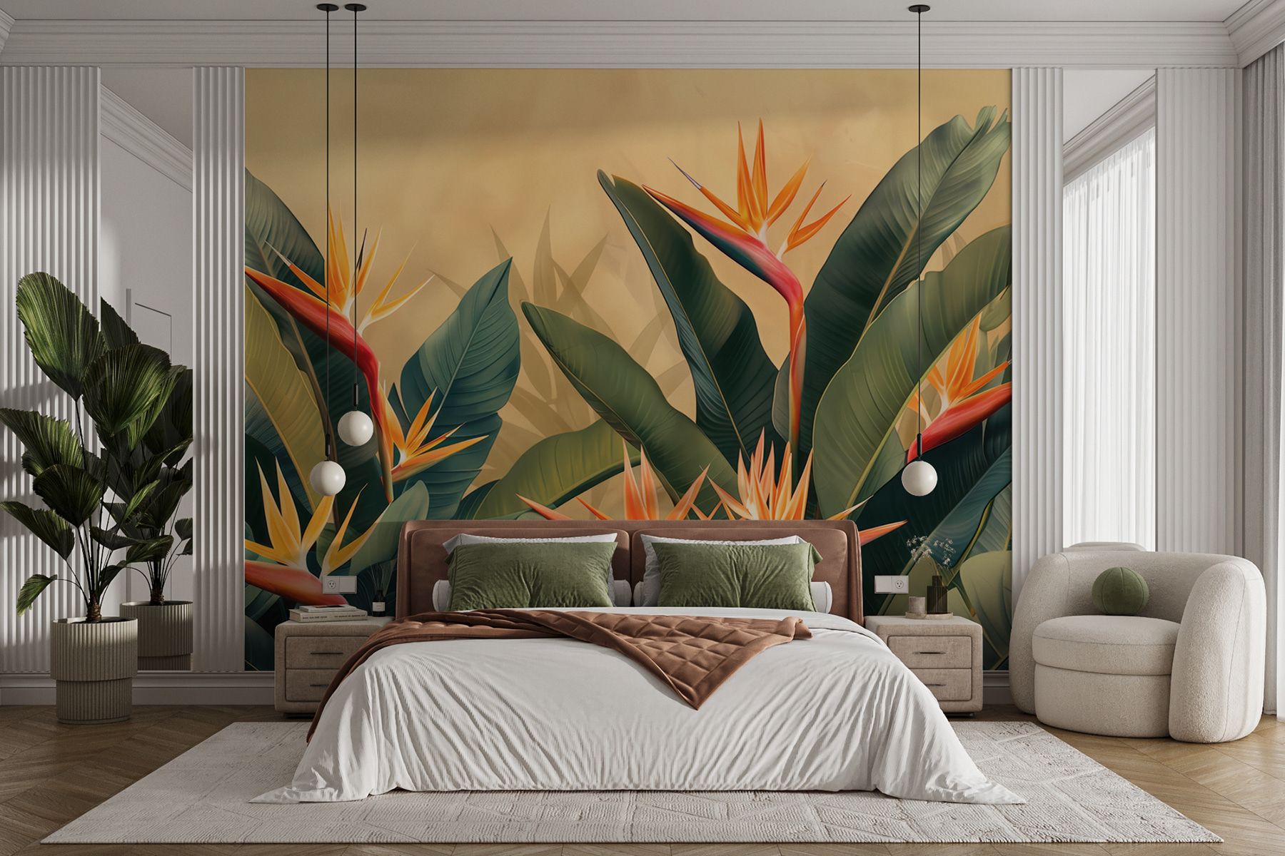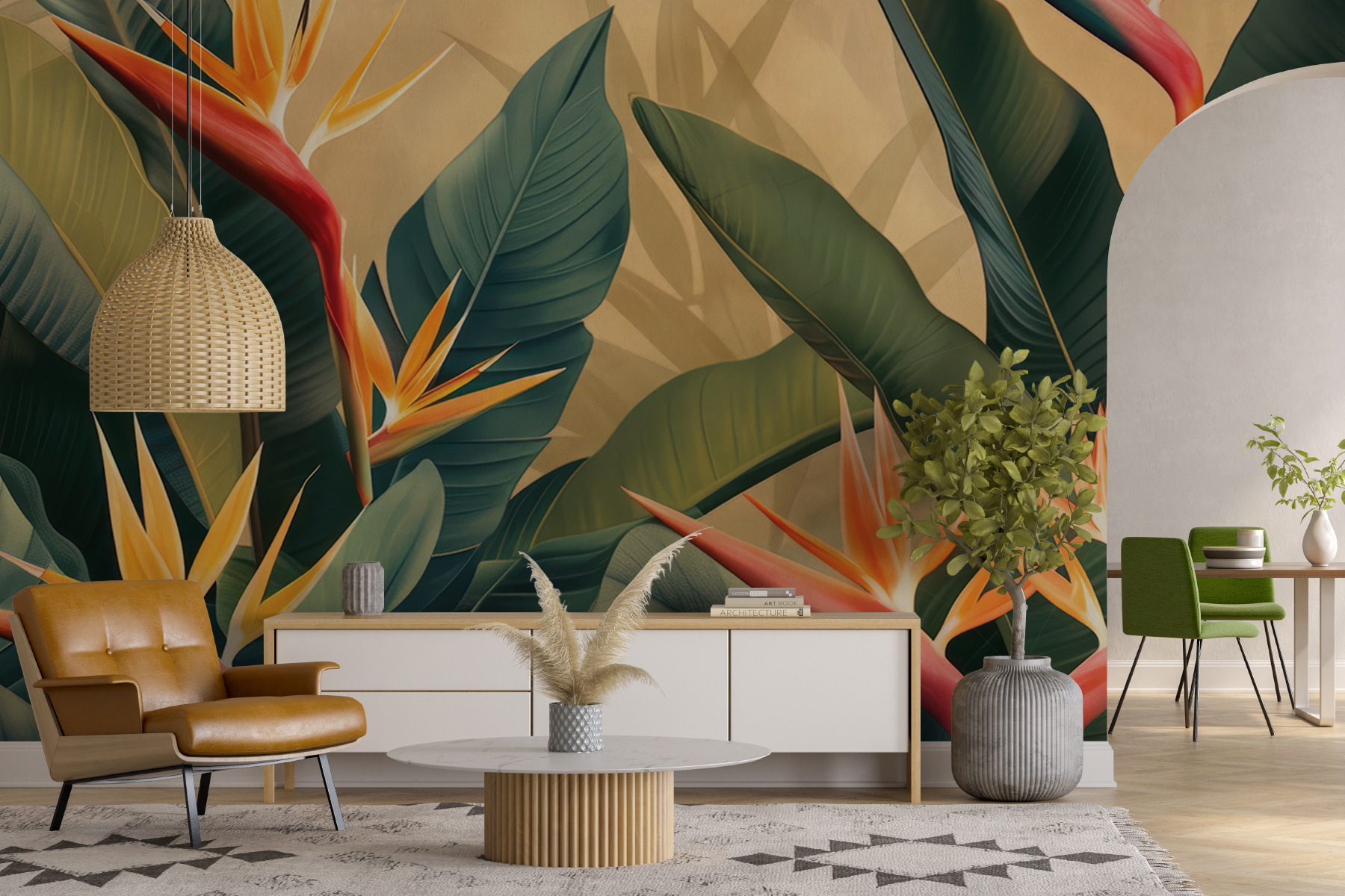 Transformez n’importe quelle pièce en paradis tropical grâce à cette superbe peinture murale représentant de vibrantes plantes d’oiseaux de paradis. Les verts riches et les oranges ardents créent une toile de fond animée, ce qui améliore instantanément l’ambiance. Imaginez que vous entrez dans votre salon et que vous vous sentez comme dans une escapade tropicale ensoleillée. C’est comme si vous faisiez entrer une partie de la nature à l’intérieur, ce qui est parfait pour les après-midi douillets avec un livre ou un cocktail à la main. De plus, c’est un excellent moyen d’engager la conversation. Les invités vous demanderont d’où vient cette fabuleuse peinture murale, et vous pourrez sourire en disant que c’est le secret de votre escapade chic !