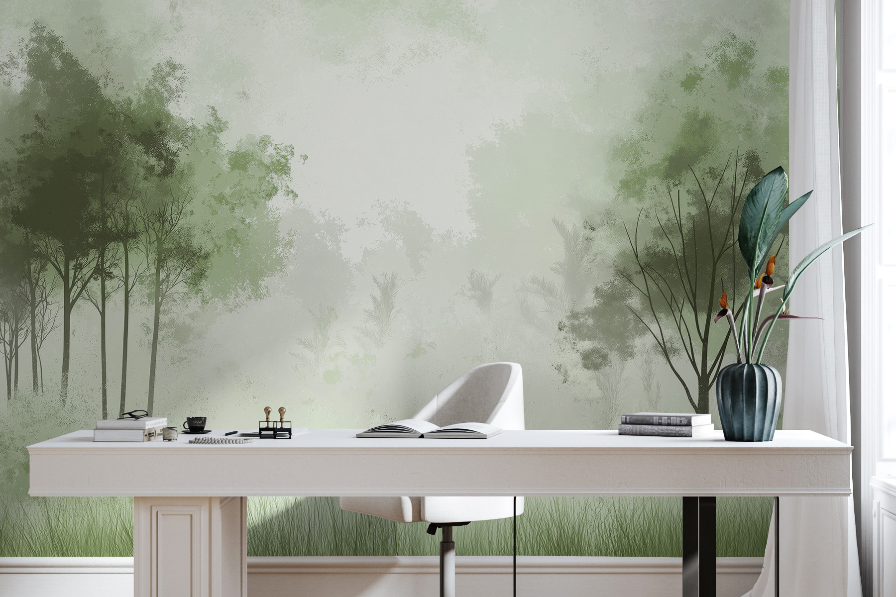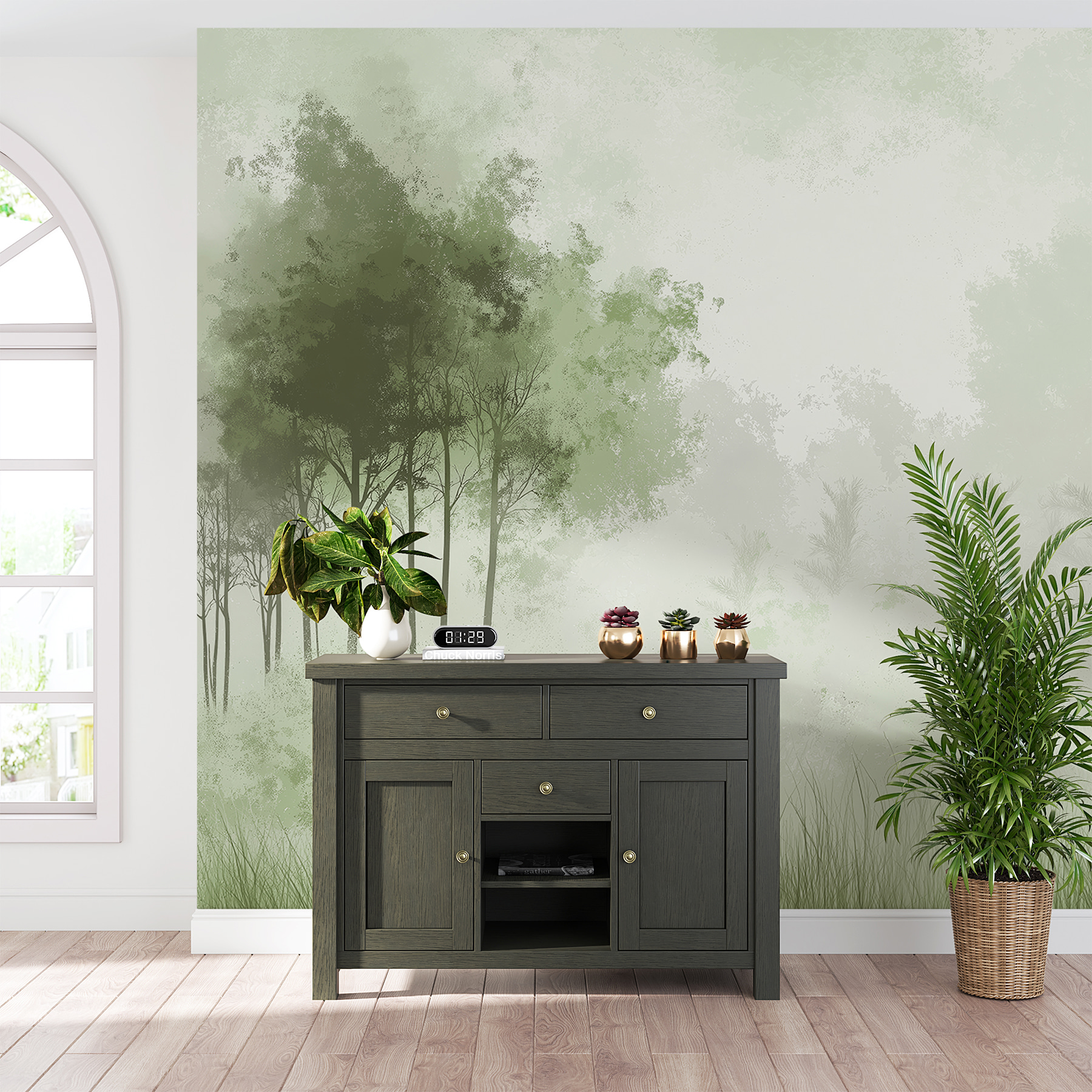 Imaginez que vous entrez dans une pièce et que vous avez immédiatement l’impression d’avoir pénétré dans une forêt brumeuse. C’est exactement ce que fait cette peinture murale “Forêt brumeuse avec arbres” – c’est comme une douce étreinte de la nature, directement sur votre mur. Elle est parfaite pour tous ceux qui aiment la tranquillité des bois mais préfèrent éviter les moustiques. Les verts doux et discrets et le brouillard mystérieux créent une atmosphère apaisante, idéale pour se détendre après une journée bien remplie. C’est le genre de chose qui peut amener votre chat à fixer le mur, persuadé qu’un écureuil est caché quelque part. Charme inattendu garanti.