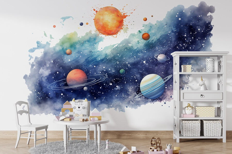 Transformez votre espace en un pays des merveilles cosmiques avec cette superbe peinture murale, “Planets in the Sky with Planets” (Planètes dans le ciel avec des planètes). C’est comme si vous faisiez entrer l’univers dans votre salon, sans avoir besoin d’une fusée. Imaginez que vous vous installez confortablement, que vous regardez ces planètes magnifiquement conçues et que vous avez l’impression de flotter parmi les étoiles. La douce aquarelle ajoute une touche de rêve et donne à chaque pièce un air d’expansion et d’aventure.