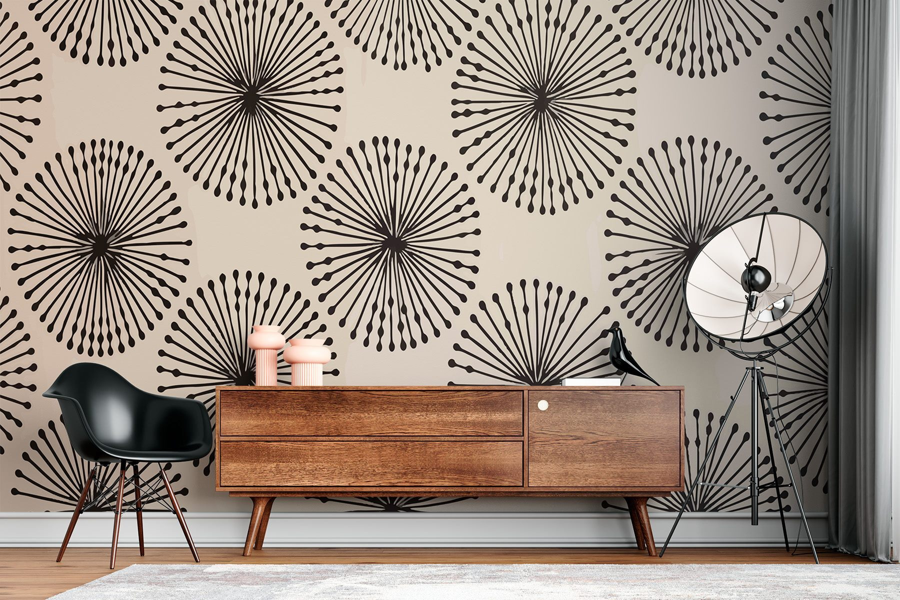 Imaginez que vous entrez dans une pièce et que vous êtes accueilli par un champ infini de pissenlits – sans les éternuements ! Cette peinture murale, avec ses cercles de pissenlits noirs et blancs, ajoute une touche de fantaisie et un soupçon de nature à n’importe quel espace. Parfait pour les rêveurs et ceux qui aiment avoir une touche d’extérieur à l’intérieur. C’est comme si votre mur avait une conversation amusante avec vous, chuchotant “Détendez-vous, laissez votre imagination flotter”. Parfait pour un coin lecture confortable ou un bureau qui aurait besoin d’un peu d’inspiration extérieure.