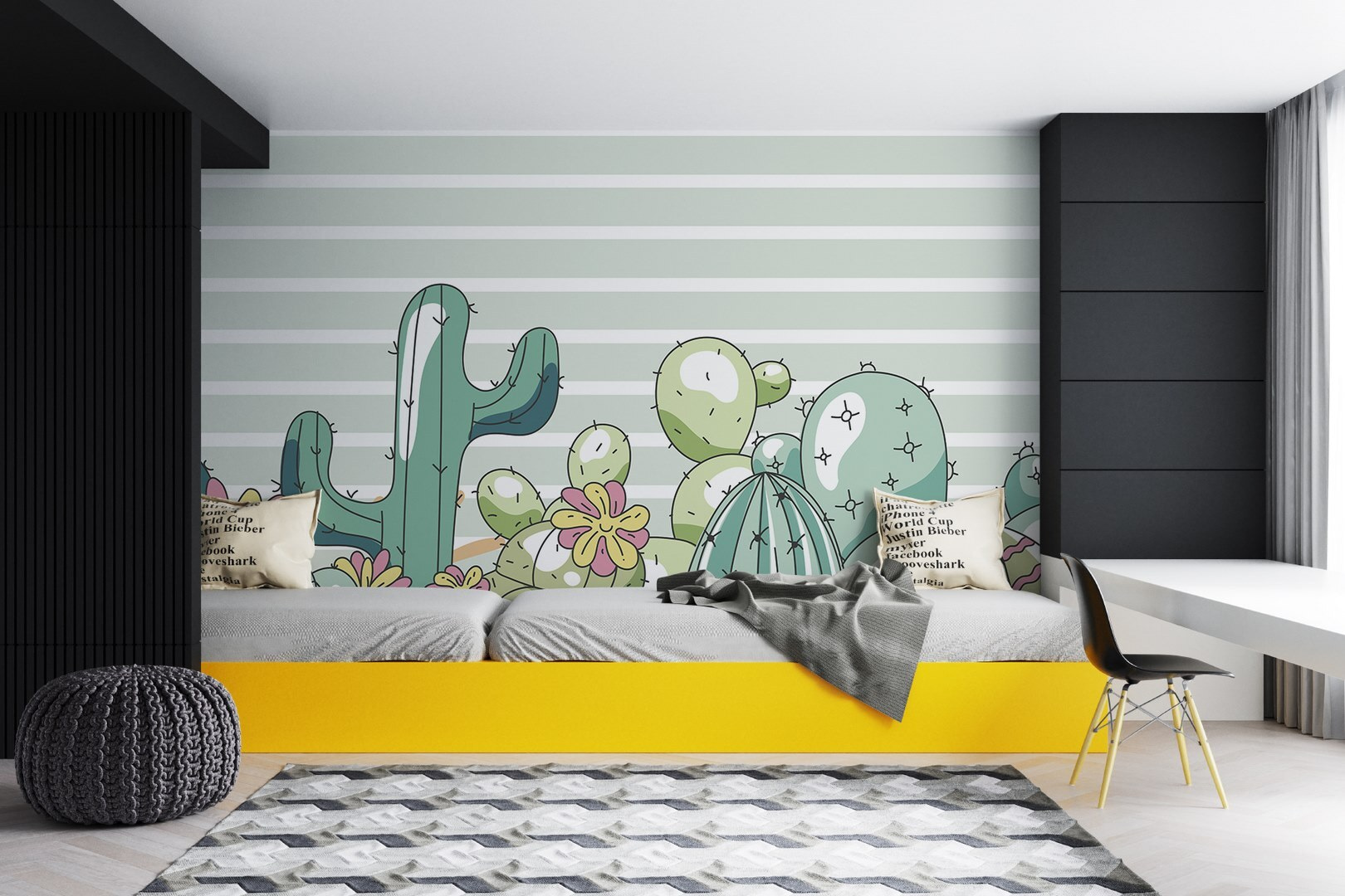 Transformez n’importe quelle pièce en une oasis ludique grâce à cette délicieuse peinture murale représentant un groupe de cactus animés et ornés de fleurs joyeuses. Imaginez que vous entrez dans un espace où ces plantes excentriques apportent un sentiment de chaleur et d’amusement, comme si vous organisiez une mini fête dans le désert sur votre mur. Les rayures douces et apaisantes de l’arrière-plan équilibrent délicatement les couleurs vives des cactus, ce qui est parfait pour une chambre d’enfant ou un coin lecture confortable. C’est comme le petit secret de la nature, qui invite au sourire et stimule l’imagination. Imaginez les enfants se blottissant dans un livre sous cette peinture murale enchanteresse, ou rêvant à leur prochaine aventure dans un jardin magique.