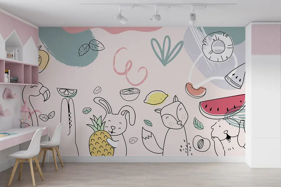 Illuminez n’importe quelle pièce avec cette délicieuse peinture murale représentant des animaux de bande dessinée tenant joyeusement leurs fruits préférés. Imaginez un flamant rose effronté savourant une tranche de pastèque ou un lapin berçant un ananas entier – c’est comme une fête des fruits sur votre mur ! Ce motif fantaisiste apporte une ambiance ludique, parfaite pour une chambre d’enfant ou un coin douillet. Imaginez que vous entrez et que vous vous sentez instantanément plus léger, comme si vous étiez entré dans une journée ensoleillée à la plage. C’est une explosion de plaisir et de couleur qui pourrait bien vous donner envie de manger une salade de fruits. Qui ne voudrait pas vivre parmi ces amis fruités ?