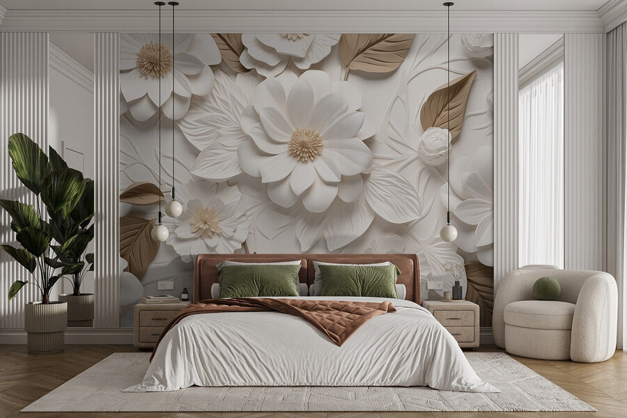 Transformez n’importe quel espace avec cette superbe peinture murale représentant des fleurs blanches et brunes enveloppées de feuilles délicates. Imaginez que vous entrez dans une pièce qui devient instantanément plus accueillante, comme si la nature avait décidé de s’installer confortablement sur vos murs ! Les tons subtils créent une ambiance sereine, parfaite pour n’importe quel décor, d’une chambre à coucher relaxante à un salon animé.